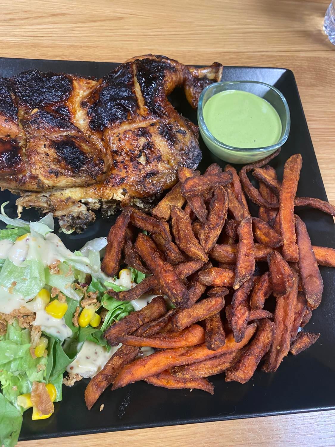 Je commande souvent ici et jamais déçue ! Le poulet est parfaitement cuit, le riz est délicieux accompagnés de frites de patates douces c’est juste parfait sans parler de leur sauce verte hyper bonne 👌 je recommande !