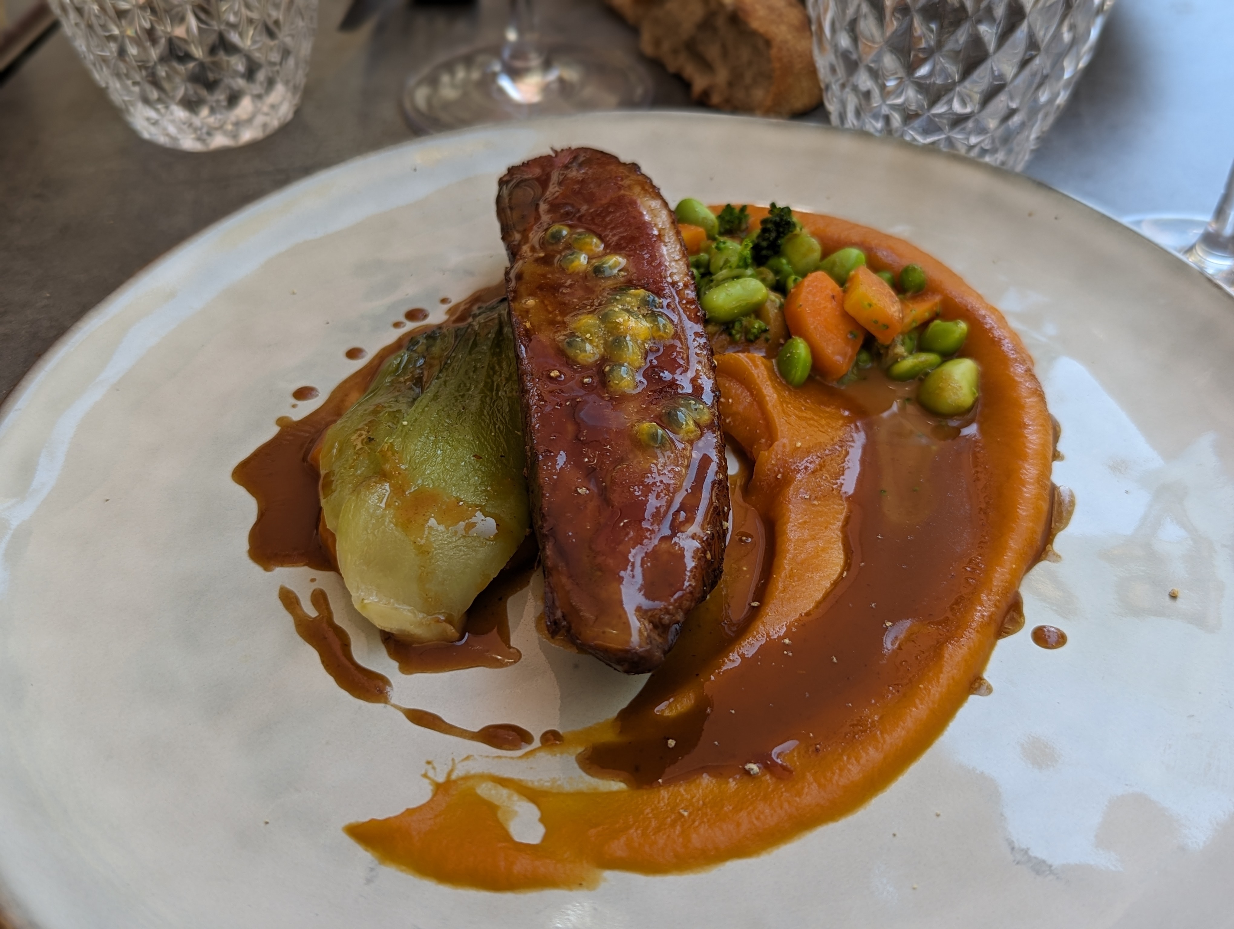 Nourriture fantastique et ambiance merveilleuse. J'ai vraiment aimé tous les plats du repas à 3 plats. Le plat principal que j'ai mangé était le pigeon au jus fort, il est très bien préparé avec beaucoup de savoir-faire. Le pigeon était cuit juste au bon niveau à l'intérieur, moelleux et juteux mais avec une peau légèrement carbonisée et parfumée.