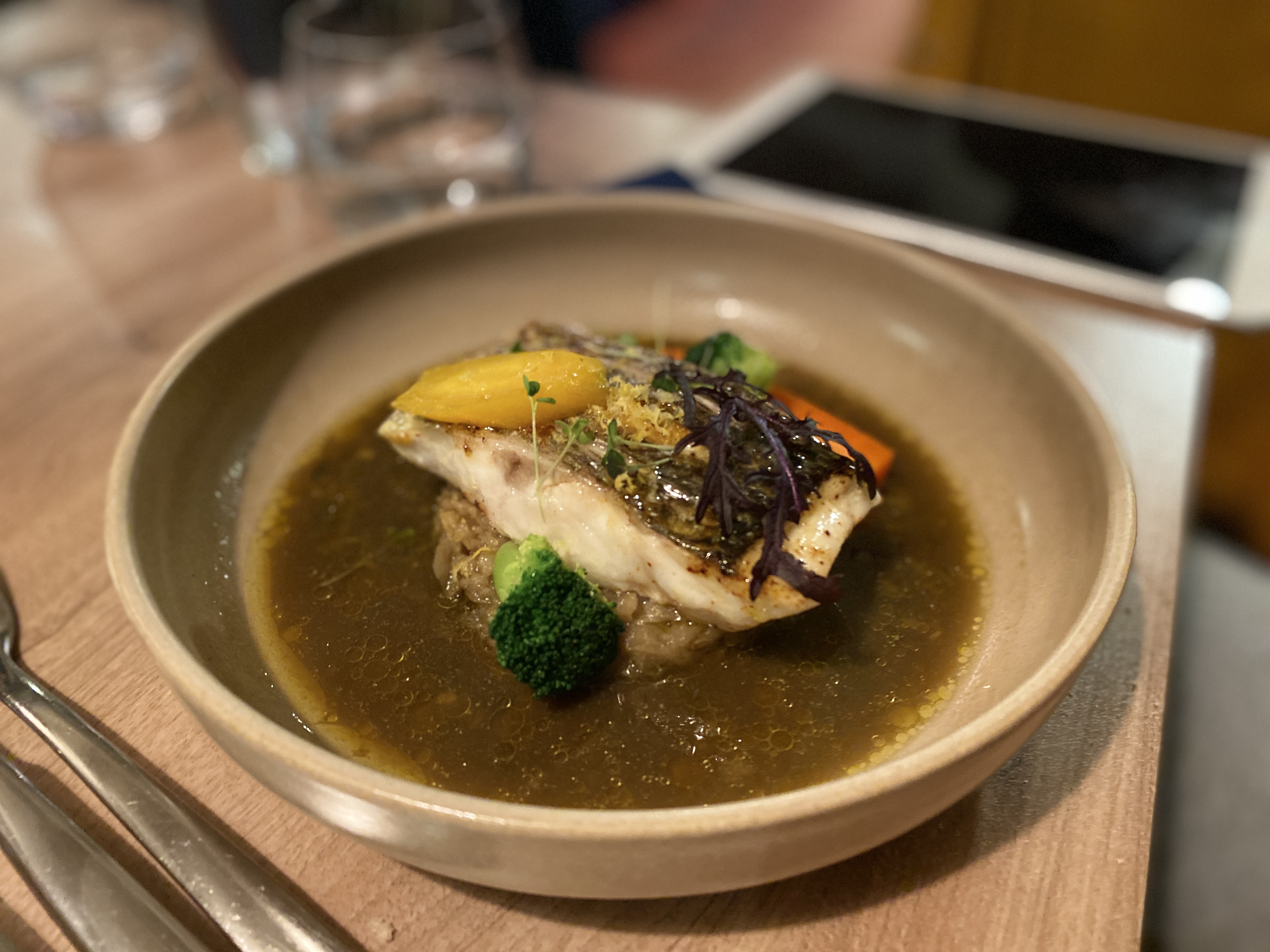 Nourritures décentes mais service moyen pour un dîner solo. On m'a donné une table d'angle même si j'avais réservé à l'avance et que je suis arrivé tôt pour le dîner et que l'endroit était toujours vide. J’ai aussi dû attendre 15 minutes juste pour avoir l’addition car apparemment le personnel est trop occupé à servir d’autres tables bondées et n’a pas eu le temps de me laisser payer (j’ai mangé seul et n’avais que 2 plats sur l’addition). Je suis allé dans d'autres restaurants qui étaient aussi occupés et bondés, mais je ne me suis jamais senti négligé comme celui-ci. Les aliments sont corrects. J'ai eu l'aiglefin et c'était sympa mais pas super impressionnant. Je suis peut-être trop déçu par l’expérience globale, car la gastronomie ne devrait pas se limiter aux aliments. Le personnel qui m'a finalement laissé payer au comptoir du bar s'est excusé, mais il était trop tard. J'ai eu suffisamment de temps pour rédiger une critique complète en attendant qu'ils prennent le temps pour moi.