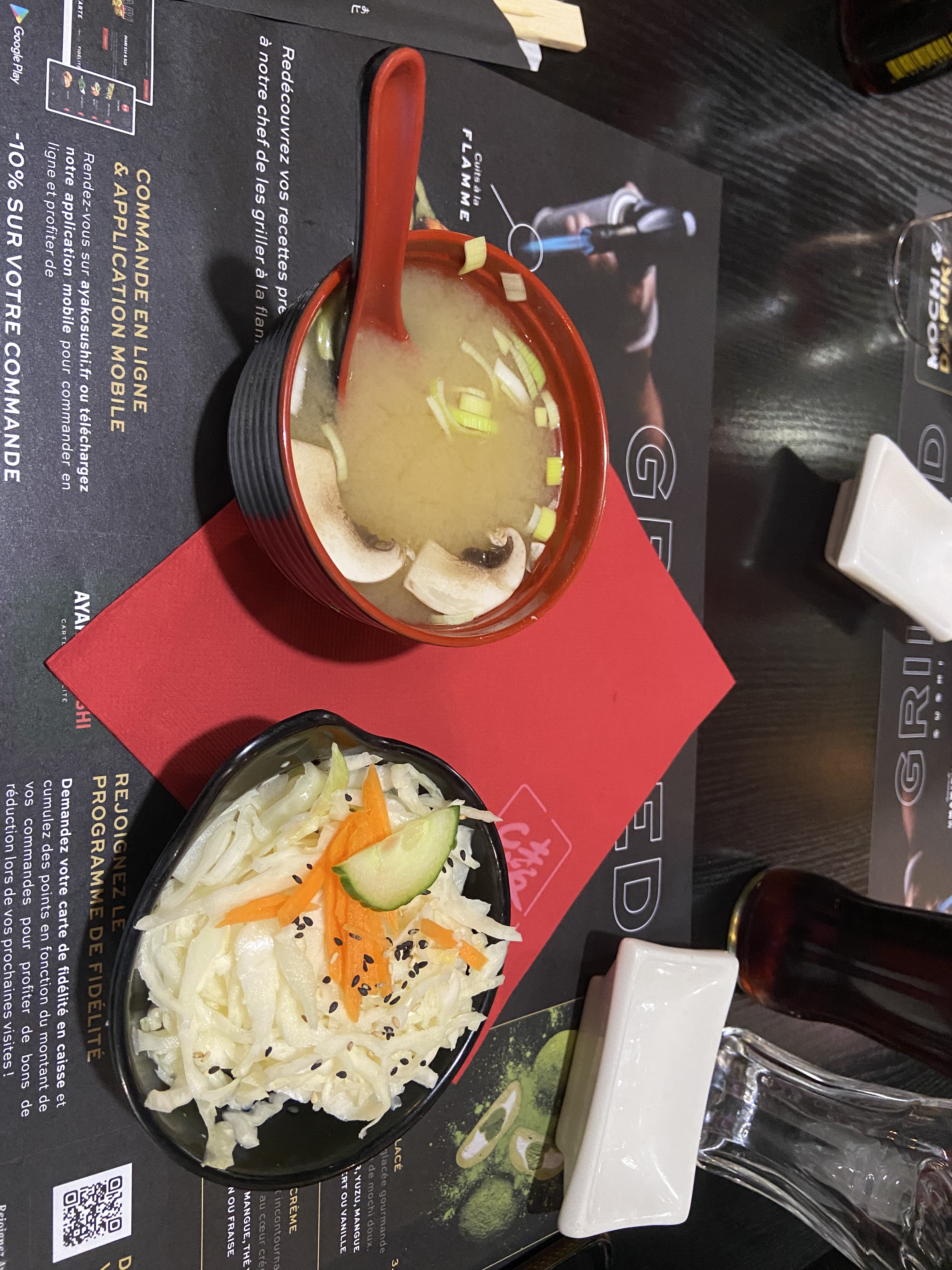 C'était franchement un des plus mauvais restaurants dans lequel il m'a été l'occasion d'aller depuis très très longtemps. Arrivés à 20h30, il n'y a pas de menu sur la table, il faut flasher un QR code sur le set de table (je précise qu'il s'agit d'un pdf de 32 pages) -soit- cela aurait été mieux si cela ne nous avait pas été signalé d'un ton parfaitement obsequieux. Je voudrais 1 bière Asahi svp Réponse du serveur qui prend la commande : Vous allez pas m'embrouiller encore plus. Ah bon. Nous recevons nos assiettes à 21h30 (oui oui 1h après avoir passé commande). Pouvons nous avoir de la sauce soja ? Non à priori ce n'est pas possible. Je pensais que nous mangions dans un restaurant japonais, j'ai du me tromper. Je passe sur la qualité gustative des plats plutôt très médiocre. On nous demande de débarrasser nous même nos assiettes. Pourrions nous avoir la carte des desserts ? Non on ferme à 22h. A boycotter absolument.