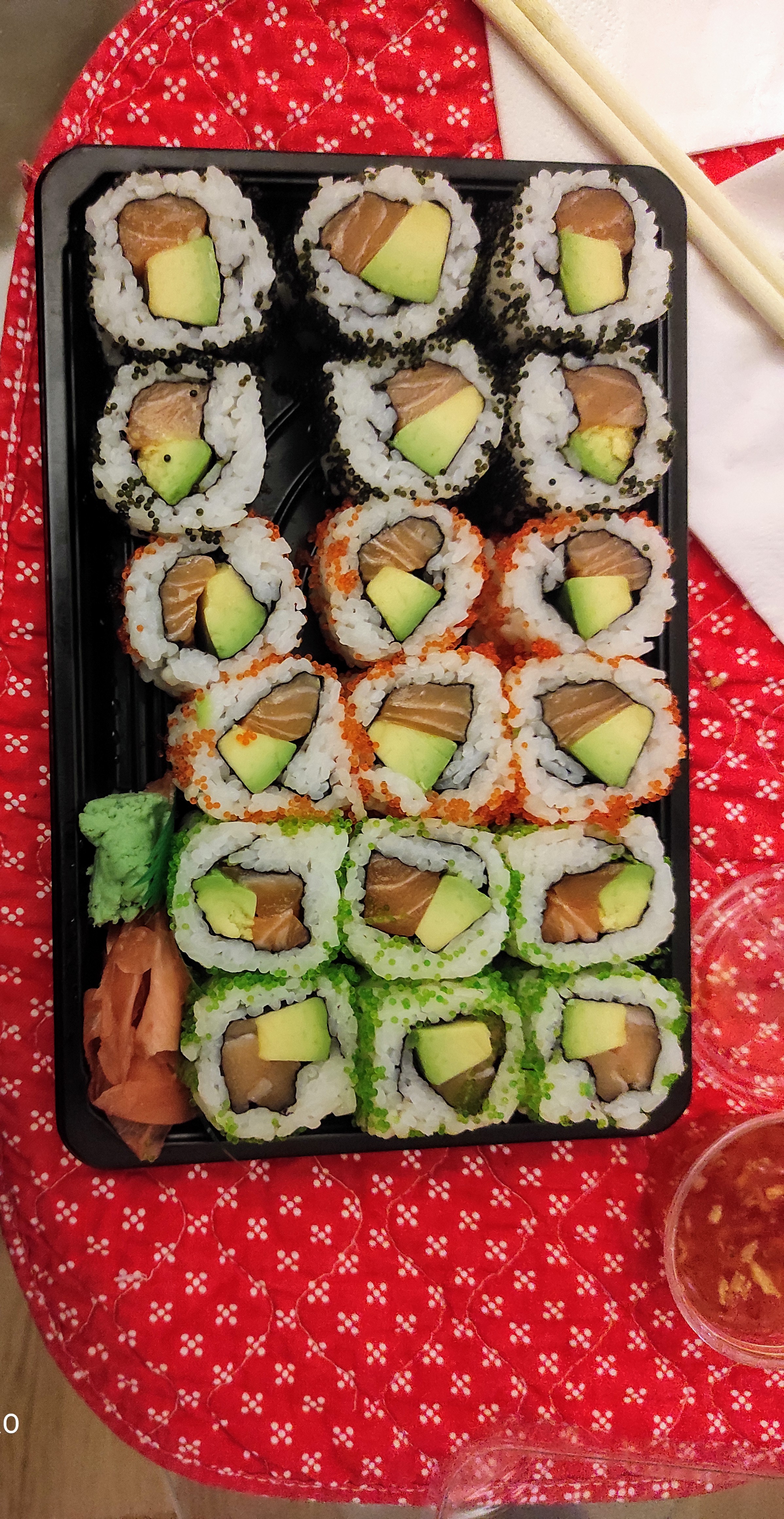 Des california rolls avec du saumon : gris / noir !!!! Pas si frais que ça, alors c'est clair que vous n'attendez pas votre plat, mais si il est préparé 10 plombes avant d'être proposé...