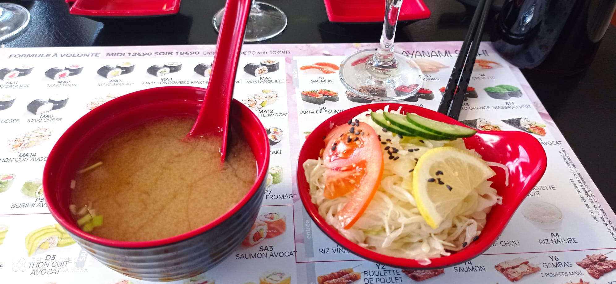 Menu du midi..12.9€ sauf que c'est que des sushis...pas de brochettes,pas de shachimis,pas le droit de partager avec ton conjoint,pas de bouteille d'eau a bulles... malgré tout la qualité est parfaite