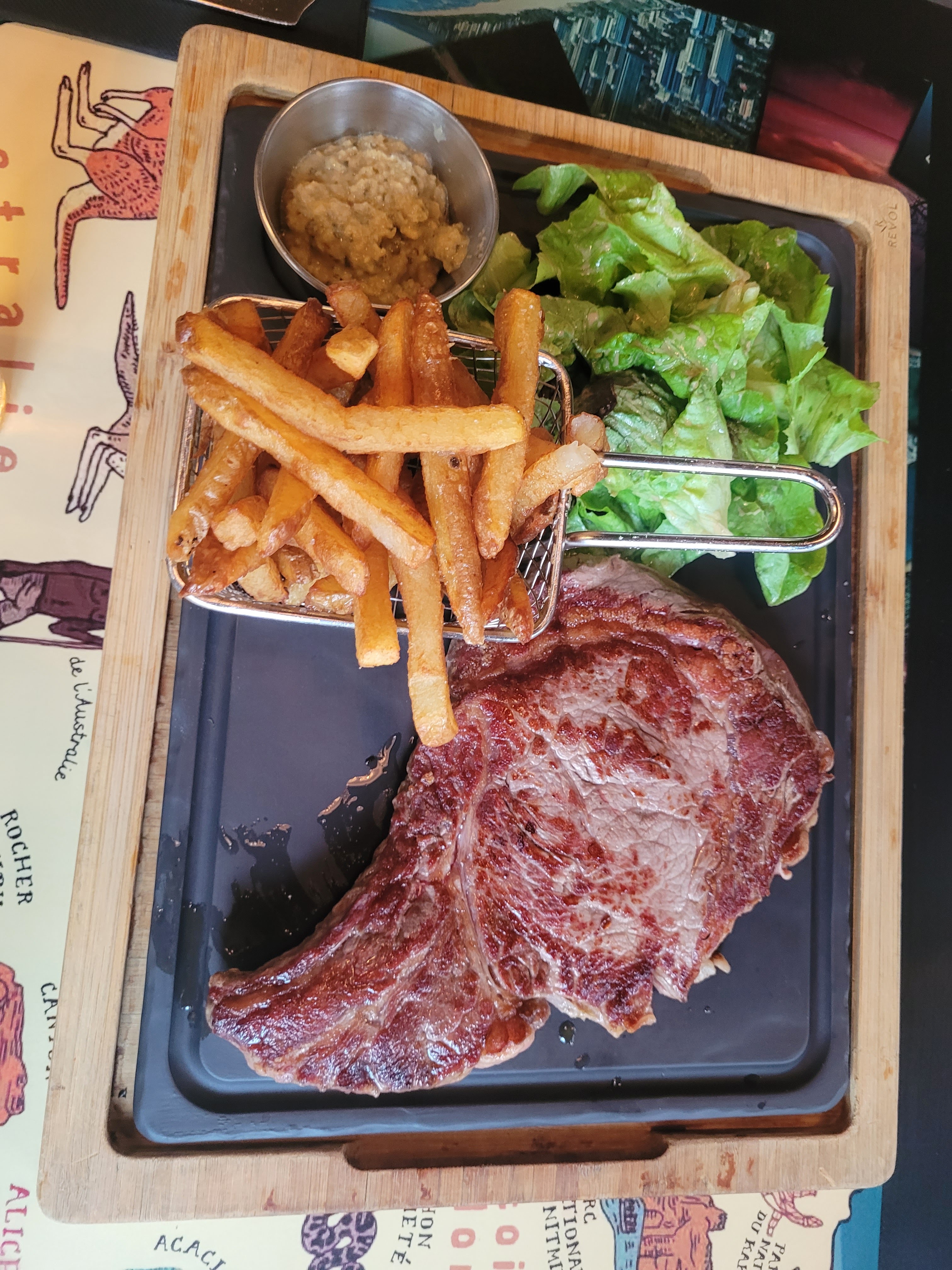 J'ai aimé le cadre moderne avec des rappels à l'Australie. Le plat était copieux, les pommes de terre sautées très bonnes, mais Je m'attendais à une viande marinée plus goûteuse et moins sèche surtout le poulet. Service à table correct.