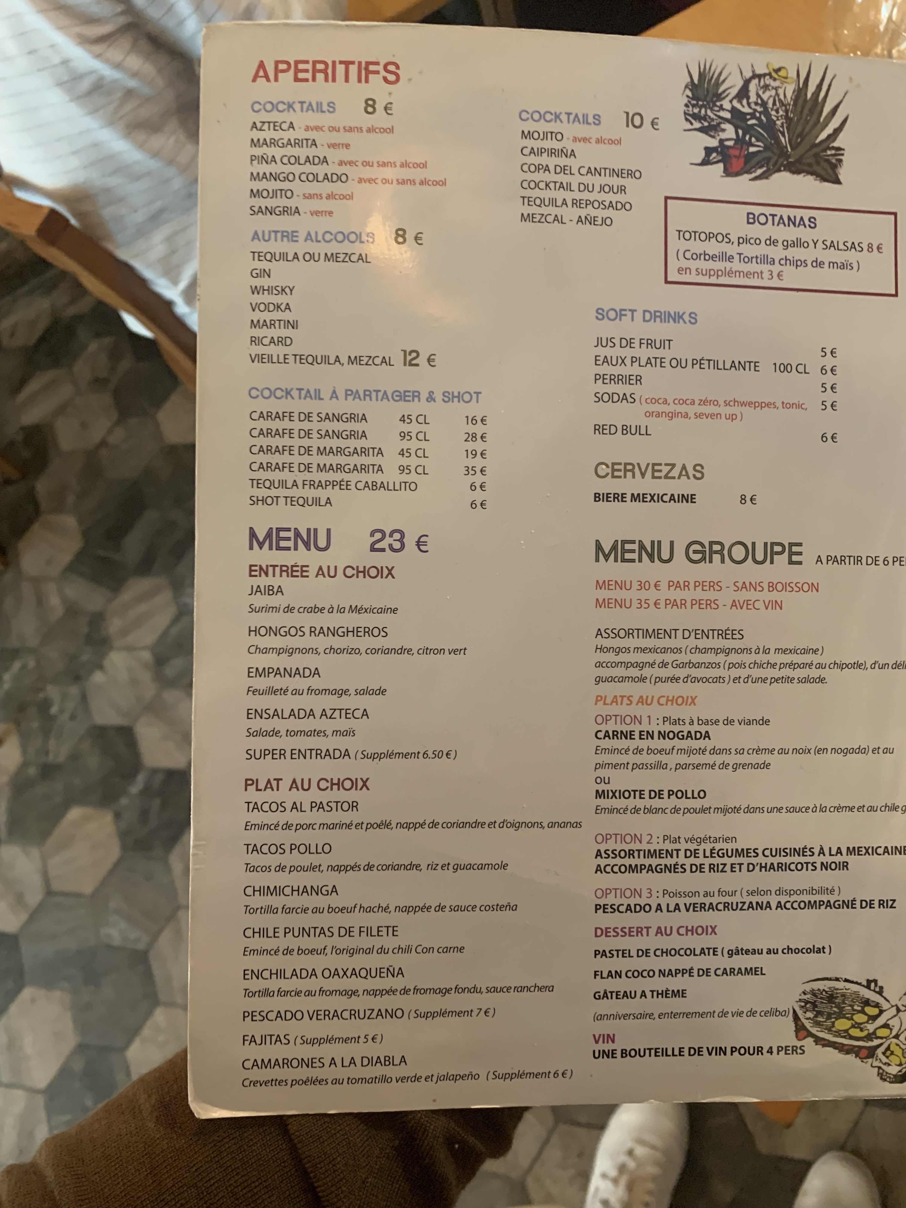 Le restaurant a changé de propriétaire et depuis c'est devenu du grand n'importe quoi. Les prix ont changé, si tu réserves via lafourchette ils timposent un menu restreint alors qu'ils n'ont pas le droit (ce n'est tout simplement pas mentionné sur lafourchette). Personnellement on a préféré laisser tomber les -20% de lafourchette pour pouvoir choisir tranquillement sinn c'était ridicule ce qu'ils proposaient dans l'autre menu. Mais au final grande déception, les plats étaient pas goûteux, on nous a servi 2 petites tortillas pour les fajitas (ce qui est très peu bien sûr) quand tu en redemandes ils te disent que c'est en supplément... Le tres leches était horrible limite immangeable. Enfin bref, j'y retournerai pas. Dommage c'était un très bon restau il y a quelques années
