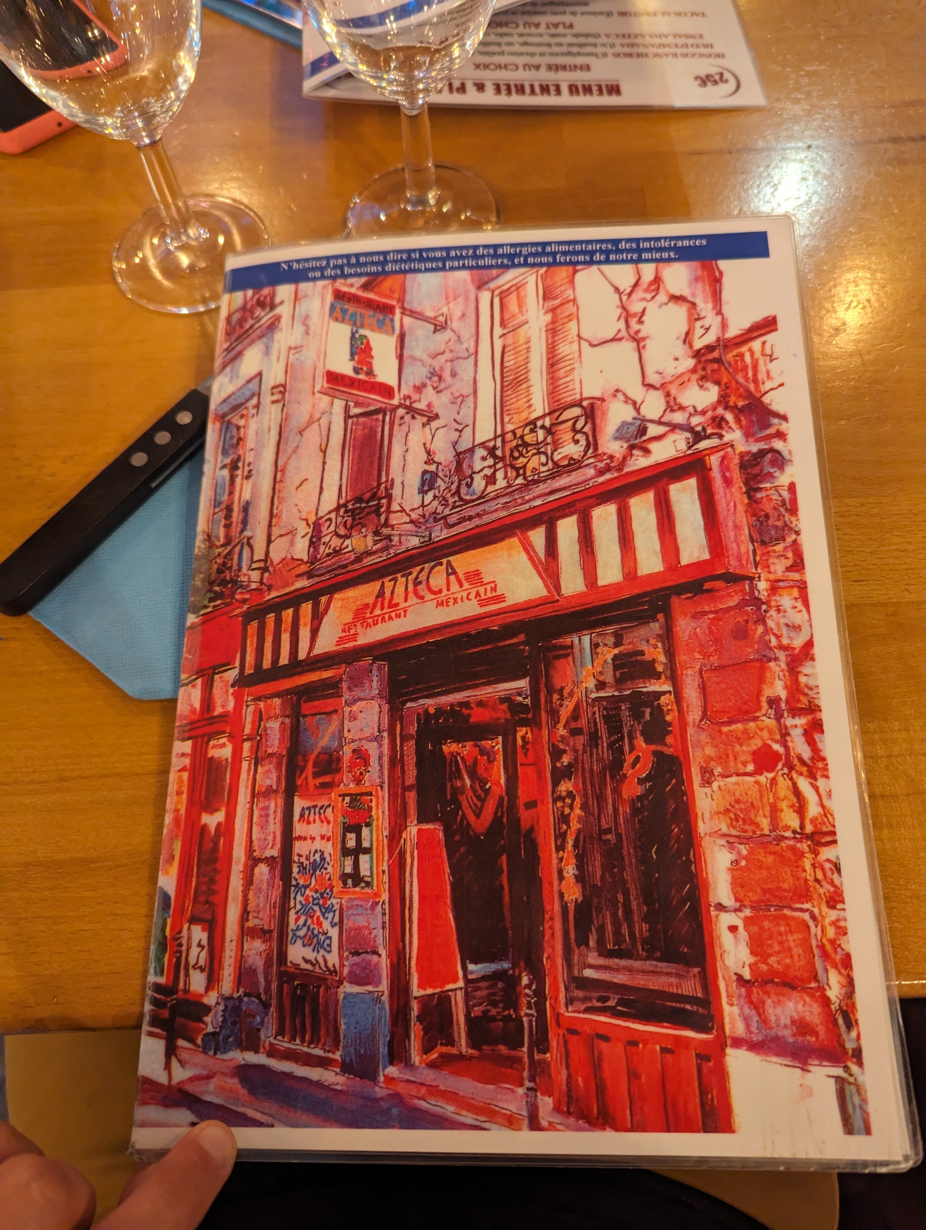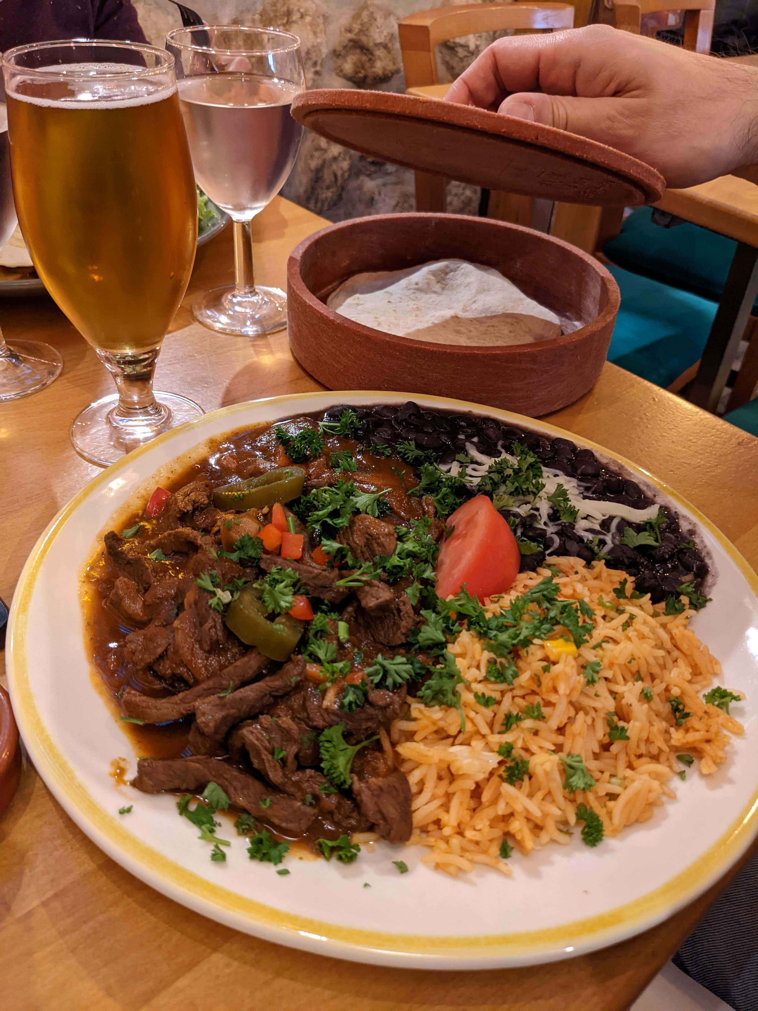 Réservation dans un restaurant Mexicain, situé dans une petite rue. L'accueil est sympathique et vous êtes tout de suite mis dans l'ambiance, agréable. On remarque tout de suite que les tables sont vraiment rapprochées, au point que le patron sera obligé de serrer des clients entre eux pour arriver à passer. Dommage. Beaucoup de choses sur la carte, trop sûrement. Après un choix difficile on prendra un apéro et un plat. L'apéro est servi en même temps que le plat, disons que déguster une margarita avec de la viande est une première. On comprend qu'il ne faudra pas s'attarder à table. Table au passage trop petite pour recevoir la commande des fajitas. Le restaurant n'a certainement jamais vu un morceau de rumsteck, car le bœuf dans les fajitas n'en a assurément pas. Je ne recommande pas. Les sauces, légumes sont excellents. La bière brune est bonne également. Au final une addition un peu salée quand on voit les prestations. Un bilan mitigé donc.