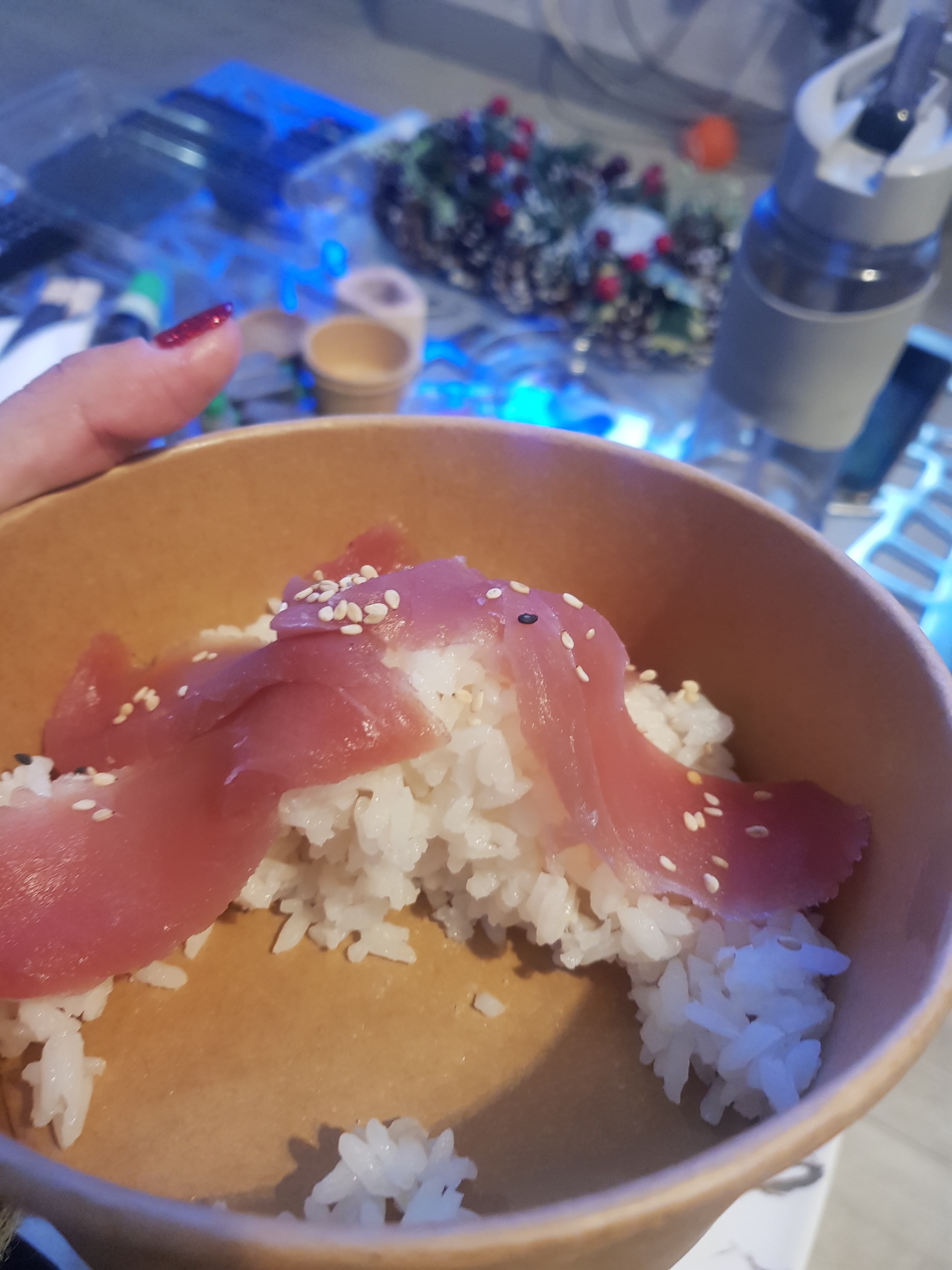 Deux fois je commande et malheureusement le riz c'est de la pâte et le thon première fois je goûte un thon avec se gout la malheureusement. Si nn accueil téléphonique au top livraison à l'heure.