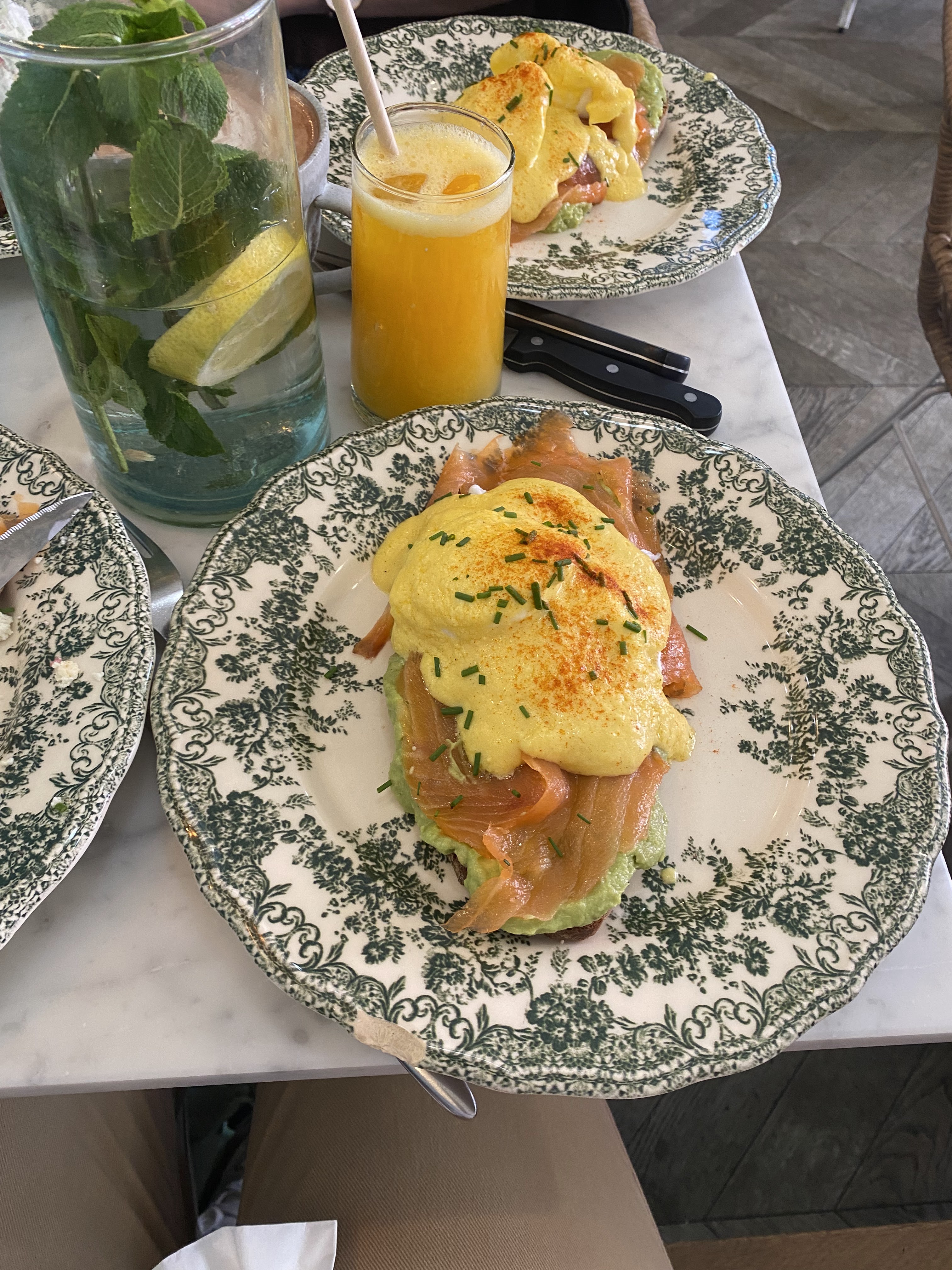 La nourriture est bonne (tout est fait maison). L’avocado toast avec saumon et œufs était très bon et généreux. Le personnel est réactif et sympathique. En revanche, gros bémols : - pas de réservation possible donc l’attente est longue (45 min dehors un dimanche vers 12h, puis 45 min à l’intérieur pour être servis), - les prix sont légèrement plus élevés par rapport à d’autres brunch du même style dans Paris, - la salle principale est en sous sol, sans fenêtre, les tables sont collés et c’est très bruyant : nous n’avions qu’une envie c’est de sortir (la salle du haut semblait beaucoup plus agréable). Le diffuseur de parfum avait une mauvaise odeur et était trop fort. En résumé : les plats sont beaux et bons mais nous ne reviendrons pas en raison de l’attente et du lieu qui ont complètement gâché notre moment.