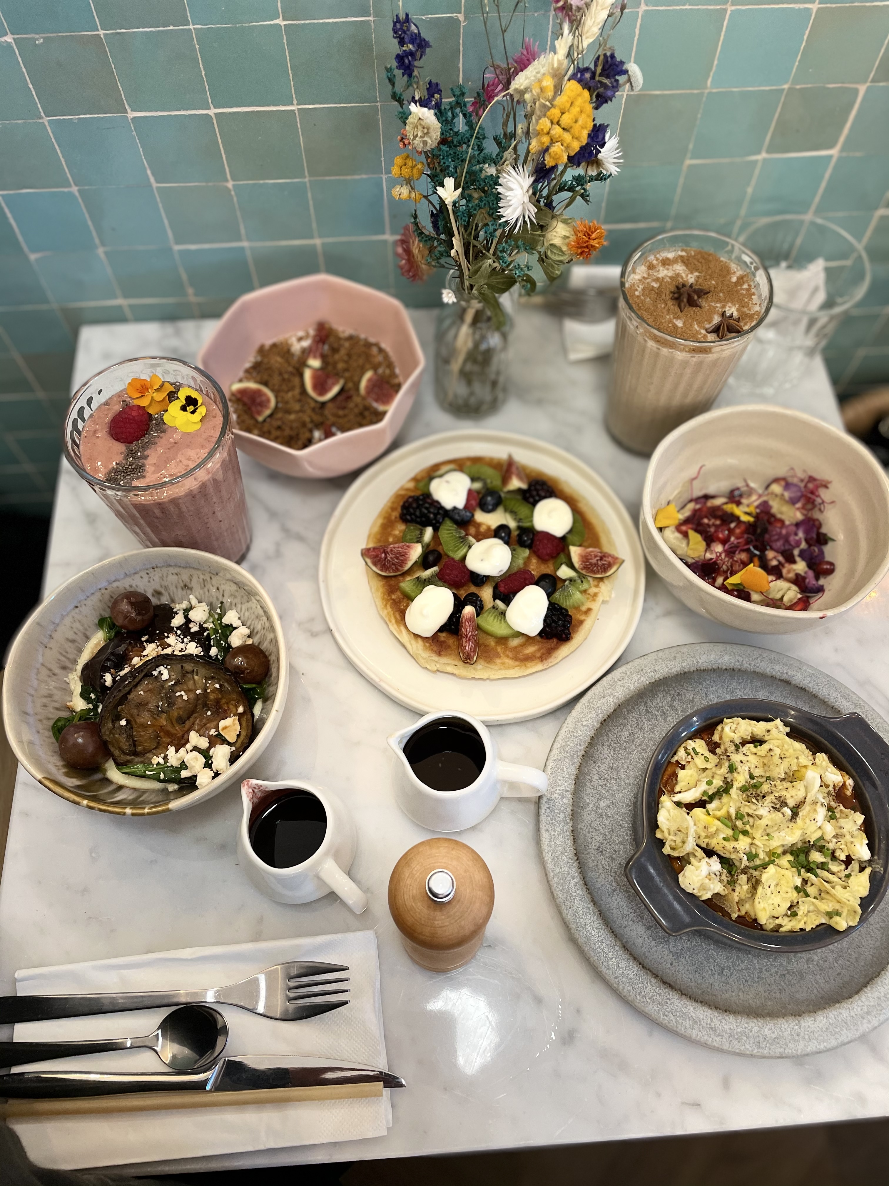 Cela faisait longtemps que l'on cherchait un endroit comme celui-ci à Paris. Des plats variés, très beaux et bien décorés et surtout délicieux ! Que ce soit la touche méditerranéenne avec une très bonne huilde d'olive pour les plats salés et la gourmandise des plats sucrés, tout est parfait ! L'accueil est très agréable, le personnel souriant. Nous avons très peu attendu avant de rentrer. Il ne faut pas hésiter à venir tout au long de la plage horaire d'ouverture.