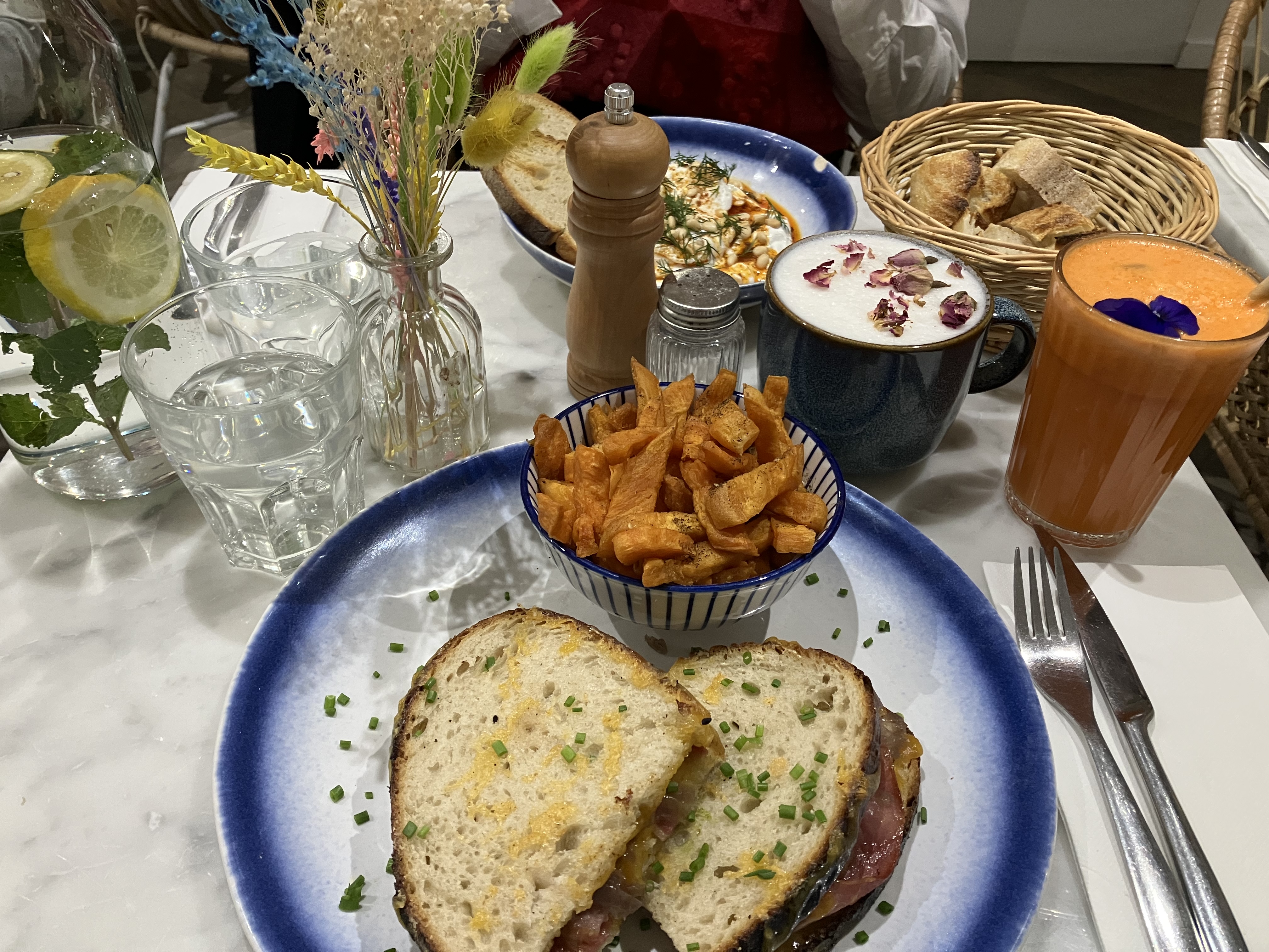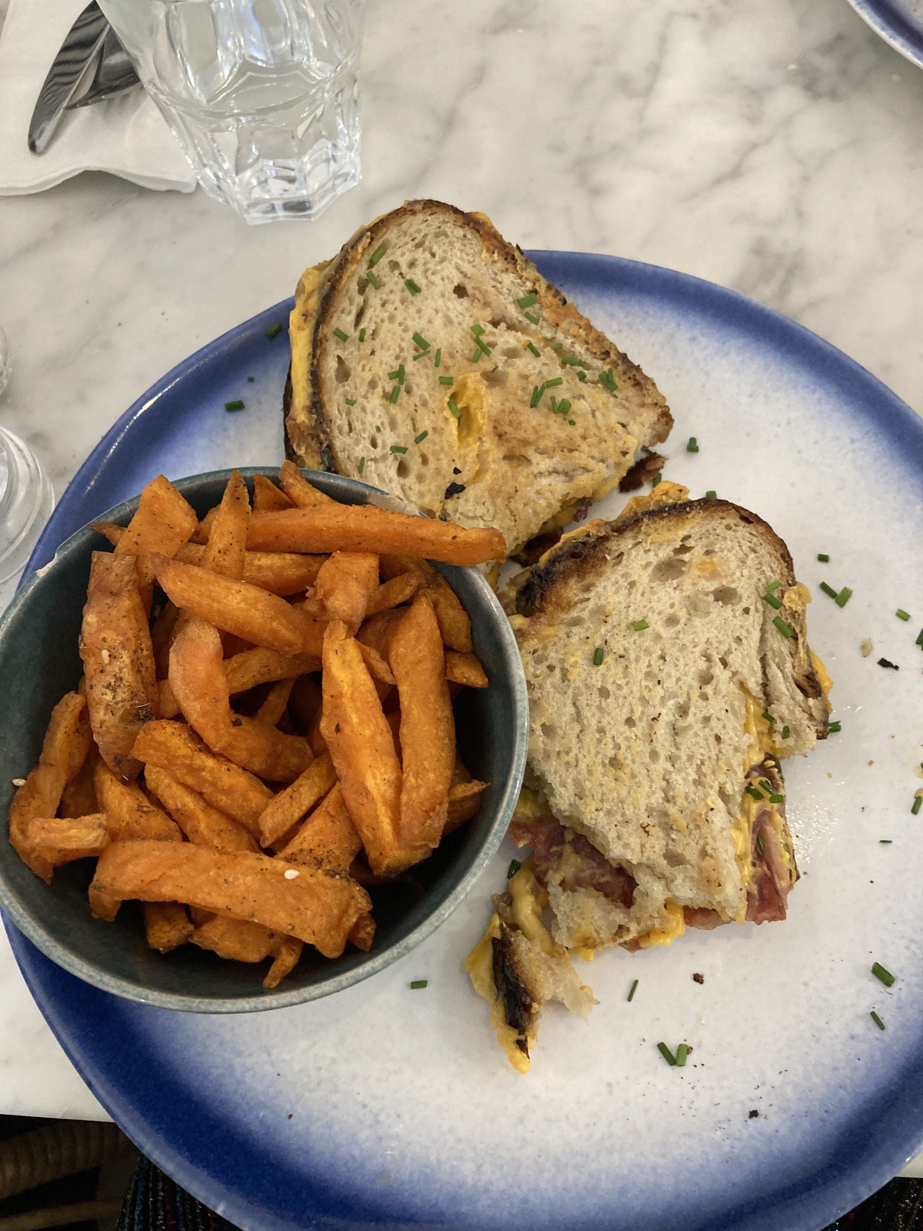 Le grill bacon cheese sandwich est très bon : pain bien grillé mais moelleux, garniture généreuse, et les frites de patate douce étaient excellentes, certaines croustillantes d'autres bien fondantes. Le service est ok, seul hic le latte froid n'avait aucun goût (ou plutôt un goût d'eau, très fade)