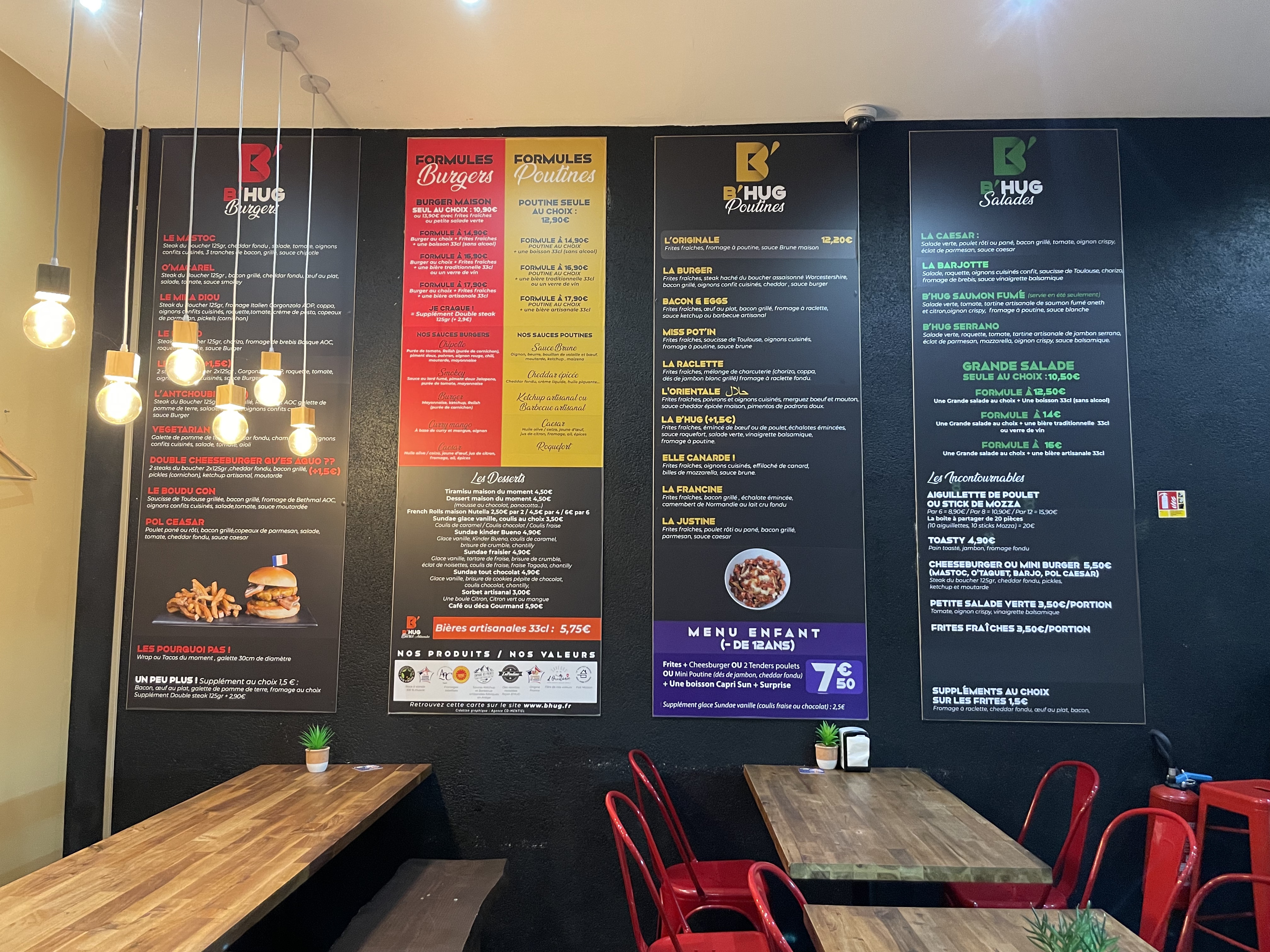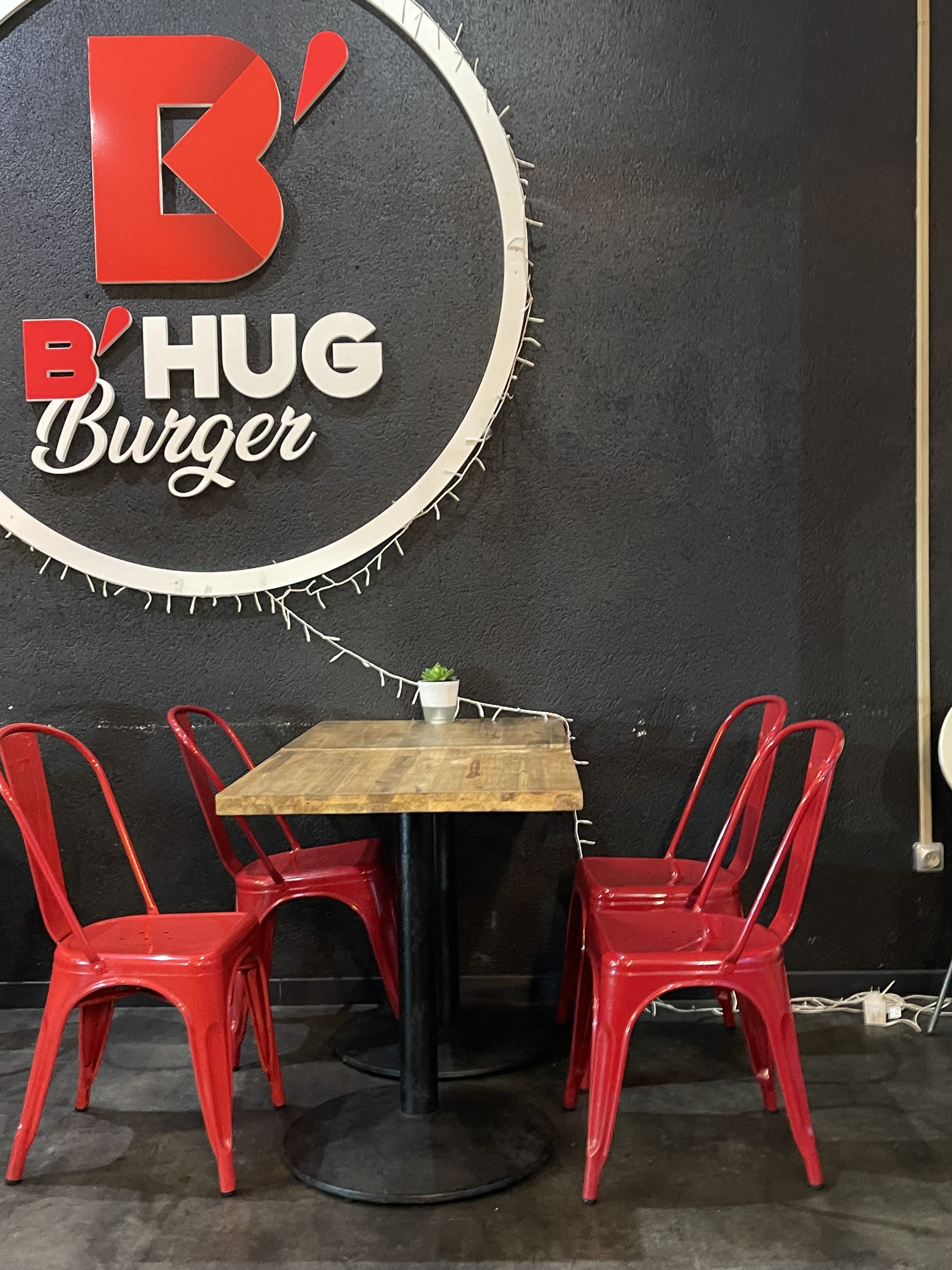 Soirée au B'Hug avec des amis et les enfants. Cadre super et très bon accueil . Les hamburgers sont de VRAI hamburgers! Bonne viande et les frites maison un délice. Un petit détail mais qui fait une grosse différence goûter le ketchup artisanal juste pour essayer...nous recommandons vraiment ce resto oui je dis resto parce que c est autre chose qu un mcdo incipide.