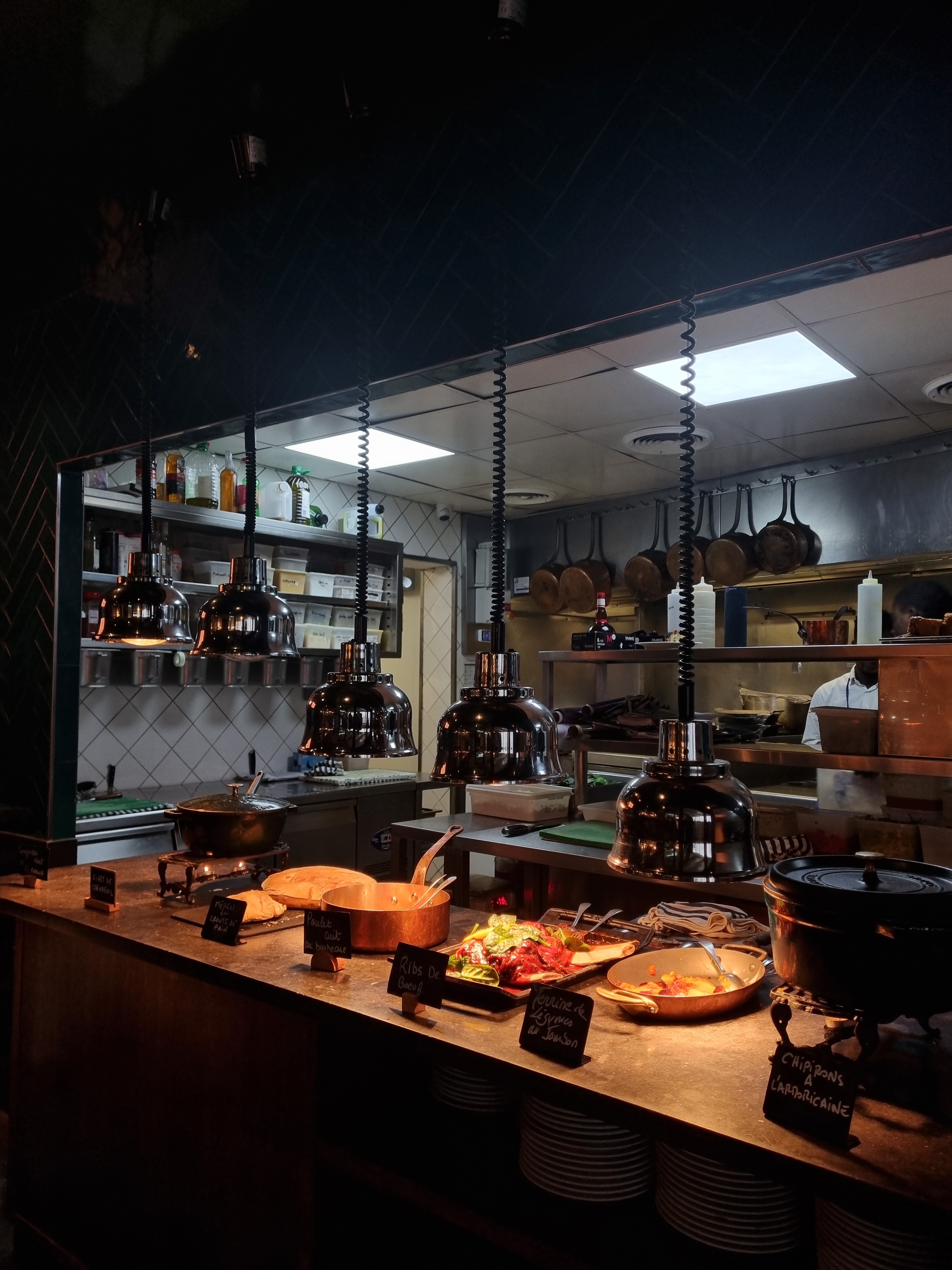 🔵🔵🔵🔵⚪️⚪️ A base de gros buffet gargantuesque, à volonté ! Évidemment tout ne peut être excellent même si une bonne majorité des mets proposés valent le coup. Mention spéciale en effet pour les ribs de bœuf, leur blanquette de veau et la mousse au chocolat. Le cadre est agréable et on n’est finalement pas trop les uns sur les autres. Une armée en salle et au service mais ça manque quand même de sourires.