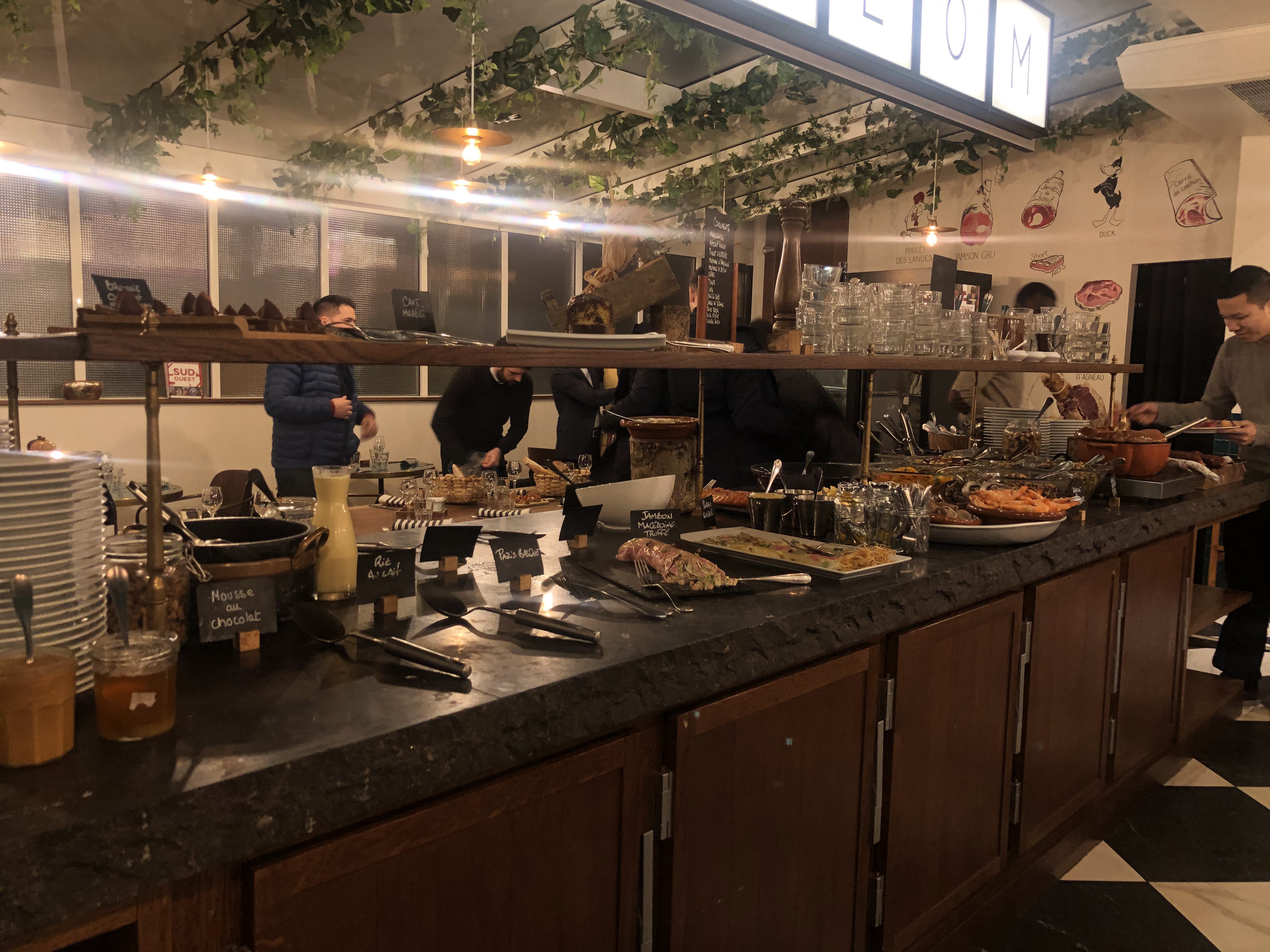 Méfiez vous des apparences ! En façade elle a l’air d’une boulangerie, mais en réalité elle cache un véritable buffet ! Nous sommes venus pour le brunch en week-end. Les 45€/personne sont payés sans aucun regret. Il y a deux buffets : un chaud et un froid. Le côté froid, situé au centre est bien fourni avec une bonne diversité: du sucré (pain perdu, tiramisu, pâtisserie) et du salé (terrine, filet de saumon, tartare de bœuf, etc) Le côté chaud est surprenant : ribs de bœuf, Épaule de cochon, tajines, etc Il y en a pour tous les goûts ! La serveuse m’a expliqué que les plats tournaient régulièrement et que la cuisine se basent sur un ingrédient phare par saison (cet hiver c’est la truffe). La salle est bien décorée mais petite. Le déjeuner devient vite bruyant. Je recommande les yeux fermés, mais je vous conseille de réserver avant.