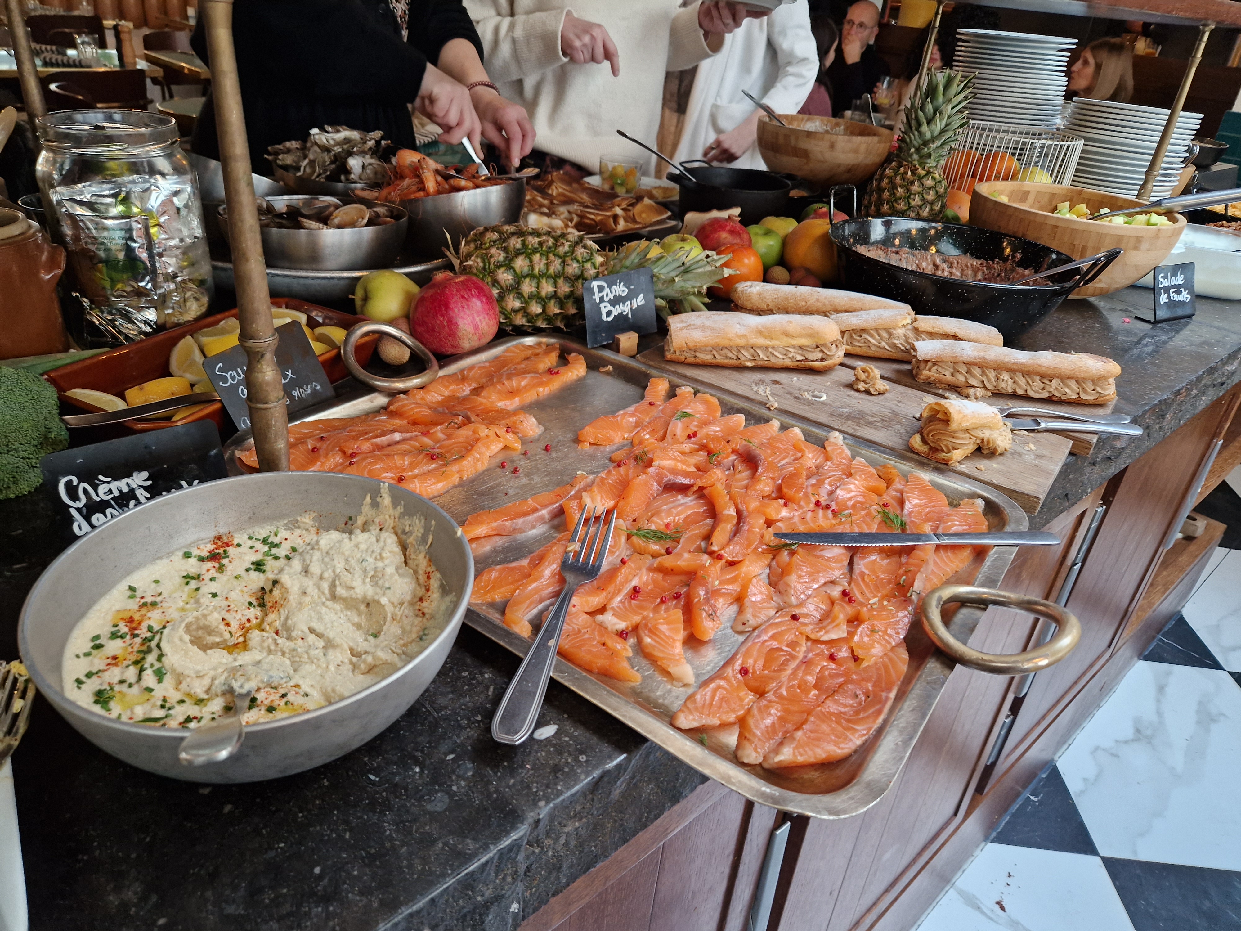 Restaurant, boulangerie pâtisserie et brunch tous les jours. On a dégusté le brunch un jour de semaine (moins cher que le week-end) pour 45€ avec un buffet spécial comme on est au mois de décembre (32€ hors décembre il me semble). Réservation obligatoire vu le monde en semaine. De nombreuses tables derrière la boulangerie pâtisserie. Ce n'est pas facile de circuler surtout pour accéder au buffet en plein milieu. Buffet des entrées et desserts au centre et un peu plus loin se trouve le buffet chaud. Quelques choix de fromage et libre service d'un stand de glace (uniquement un sorbet poire lors de ma visite). Très dommage de n'avoir aucune boisson incluses ni de viennoiseries dans la formule pour un brunch, c'était plus un restaurant du coup. La nourriture était qualitative dans l'ensemble avec de bonnes salades, une excellente soupe avec de bons assaisonnements. Les viandes et le poisson avec leur sauce étaient bien cuisinés et les accompagnements étaient goûteux. J'ai regretté de ne pas avoir plus d'option végétarienne, surtout au niveau du buffet chaud. Il n'y avait aucun plat végétarien, juste les accompagnements. Je mange de la viande mais je suis tendance végétarienne et à ce niveau là seul le buffet froid à quelques propositions mais c'est assez réduit. Le service au buffet chaud était agréable et le buffet était bien approvisionné.