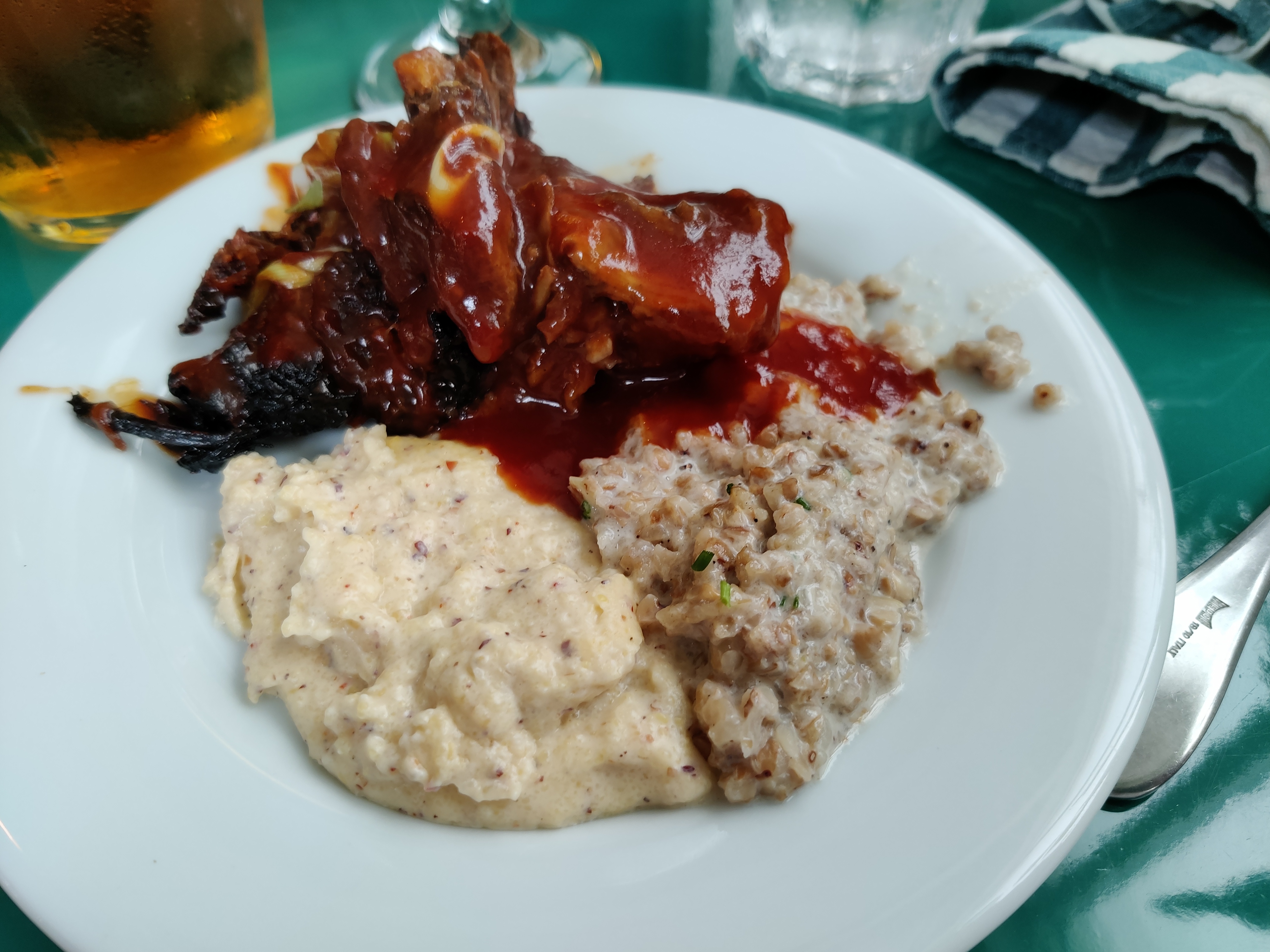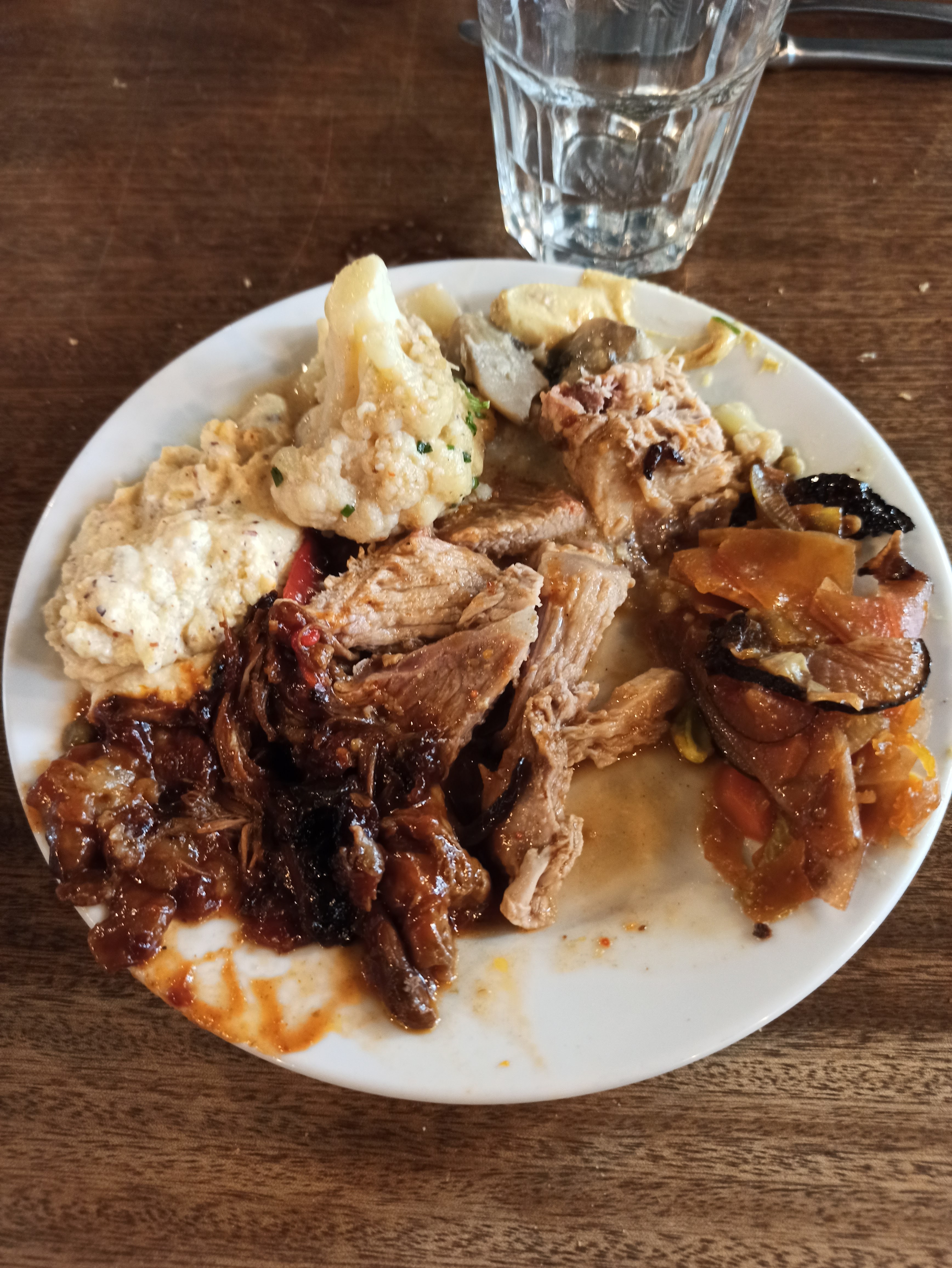 Très bon moment, un buffet varié, des entrées simples mais si bien réalisées et ça ce n'est pas simple 😁. Je me suis régalé de ribs de boeuf fondantes avec une sauce barbecue maison chaude, la volaille tout aussi délicieuse, une polenta crémeuse. Et les desserts, les photos veulent tout dire. A faire et refaire