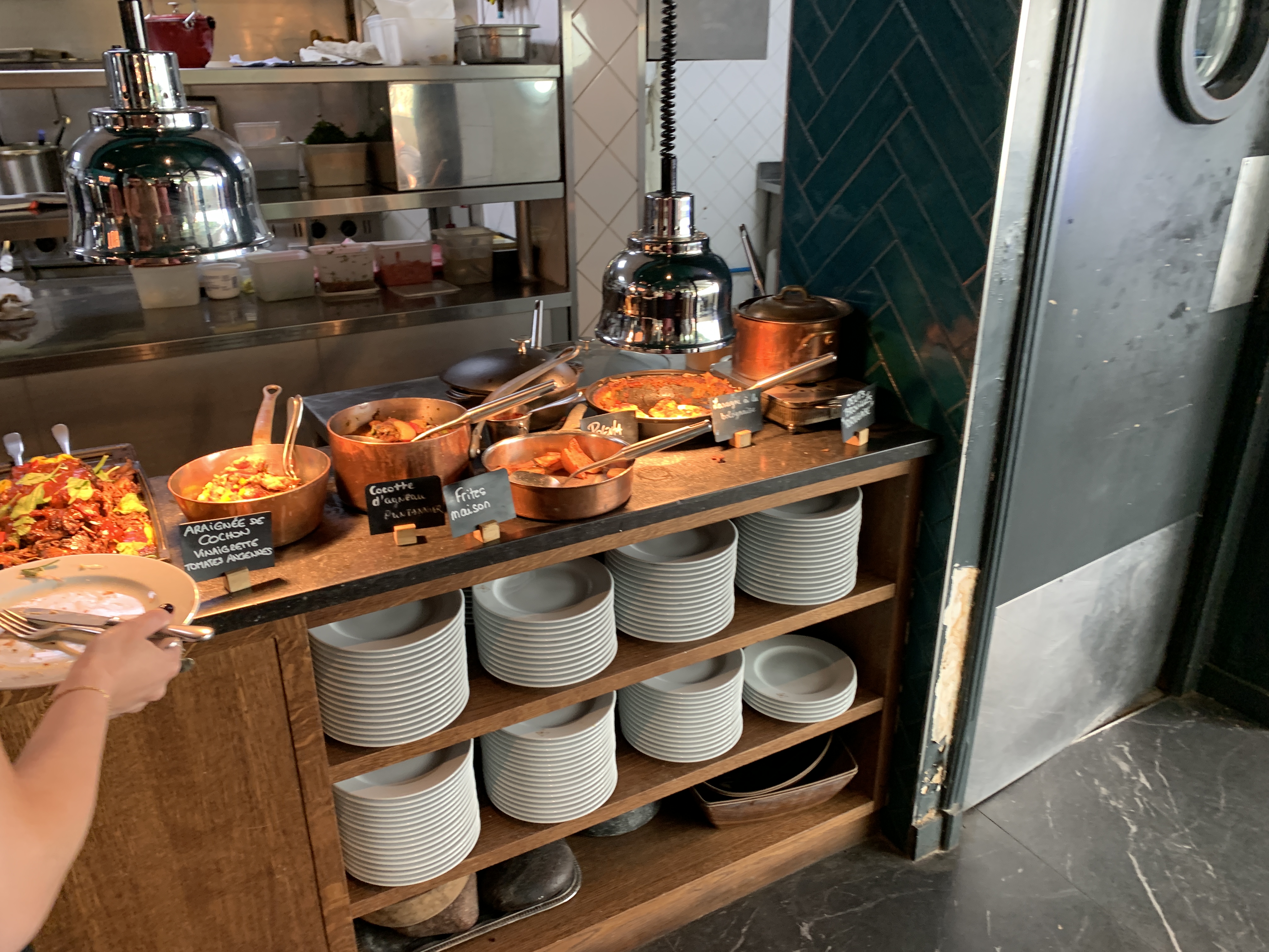 Attirée par le reportage d'une chaîne de télévision, nous avons voulu testé : déçues surtout par la fraîcheur des produits : les entrées et desserts sont posés au centre de la pièce sur un comptoir noir (du marbre?) Depuis quand ? Tout est tiede: terrine, salade, desserts, fromages avec les moucherons. Jambon impossible à découper. Manque évident d hygiène. Du côté du bar : entassement de cartons,bouteilles, personnel qui va et vient : que font ils ? Beaucoup d agitation pour rien. Bref nous ne reviendrons pas, il y a d autres lieux à découvrir sur Paris