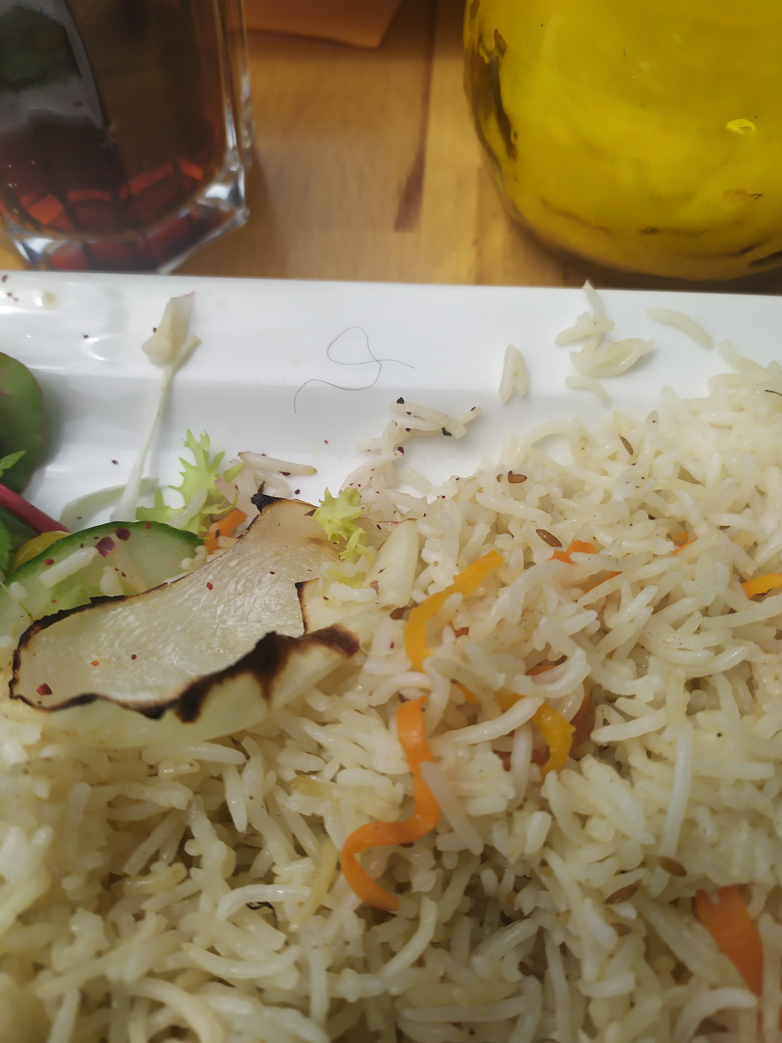 Au début, tout s'est bien passé :bon accueil, place en terrasse puis arrive les plats:grillades pour nous 2.Et là,au milieu de mon plat:un cheveu !!!Le serveur reprend mon assiette.. ça m'a coupé l'appétit direct..Le gérant me propose une autre grillade 🤔ben en fait, c'est dans le riz que je l'ai trouvé ..aucune excuse,pas de geste commercial..ah si,il me propose un thé mdr!!Bref,jsuis super déçue et pas prête d'y retourner 😠