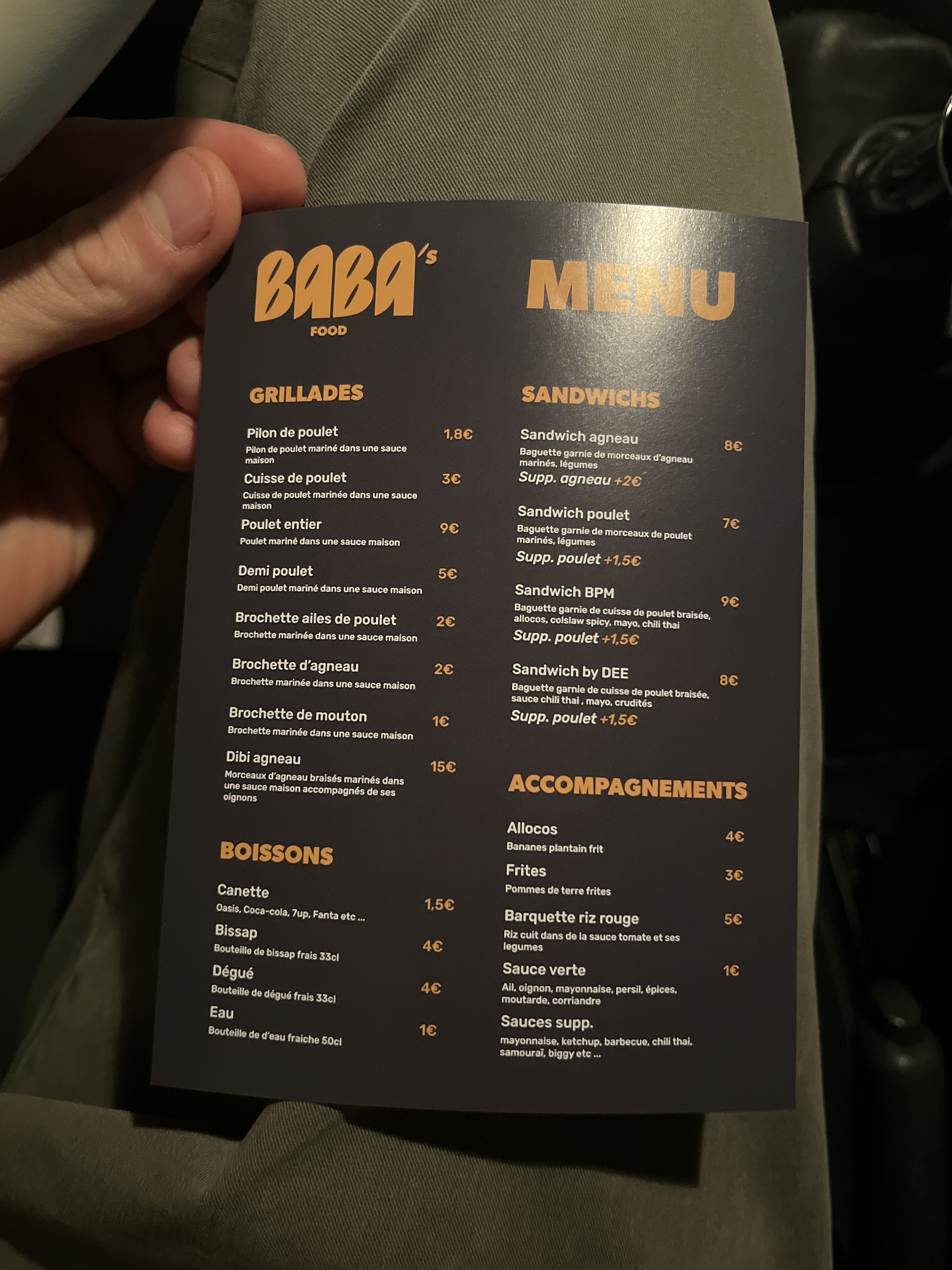 Je suis passé hier chez baba franchement on a trop bien mangé rien a dire le sandwich, le dibi ,le poulet 👌🏾😋 tout été très bon je recommande et je reviendrai in sha Allah qu'Allah vous facilite Amin 🤲🏾🥰