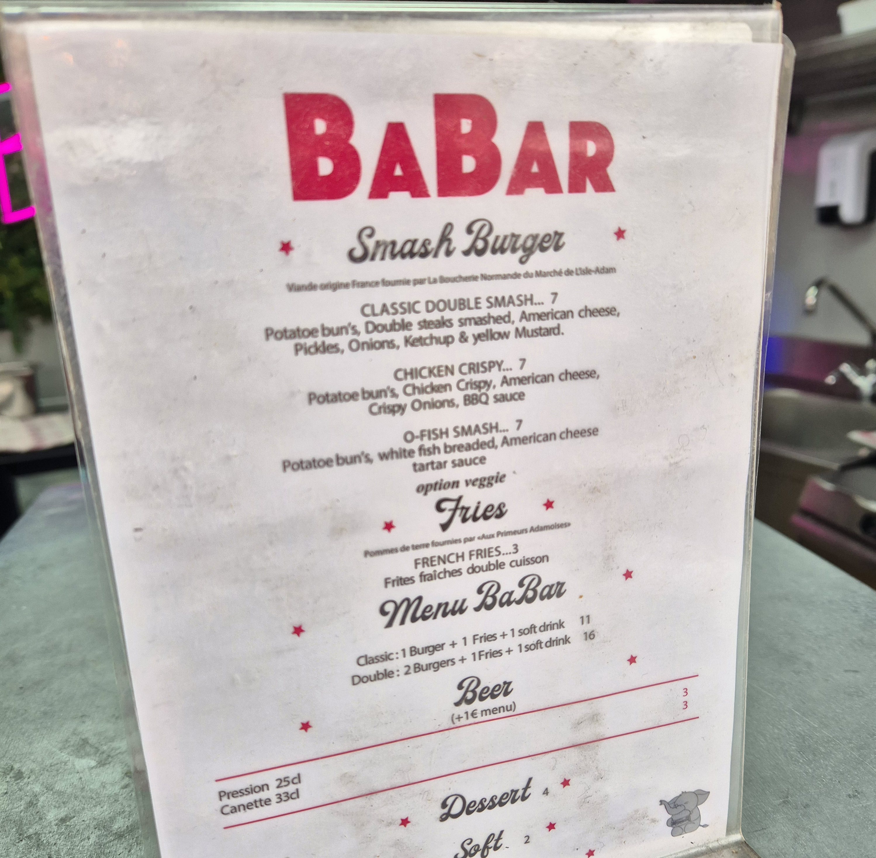 2 fois que je me décide à enfin essayer ce fameux Burger de chez Babar, il est 20h30 et 2 fois que le restaurant est fermé alors qu’il devrait être ouvert ( fermeture indiquée à 22h) déçue et je n’irais plus (devant).