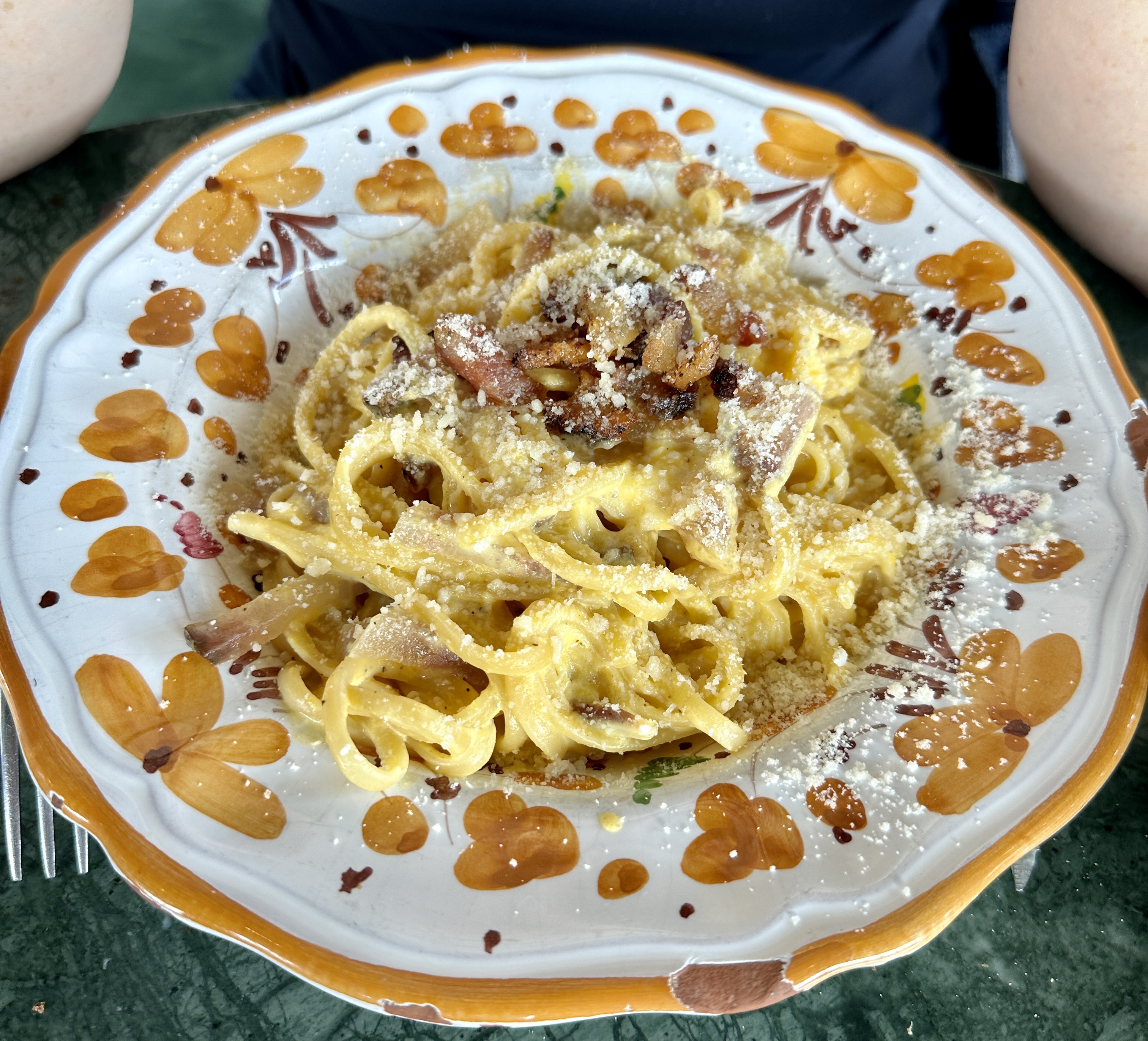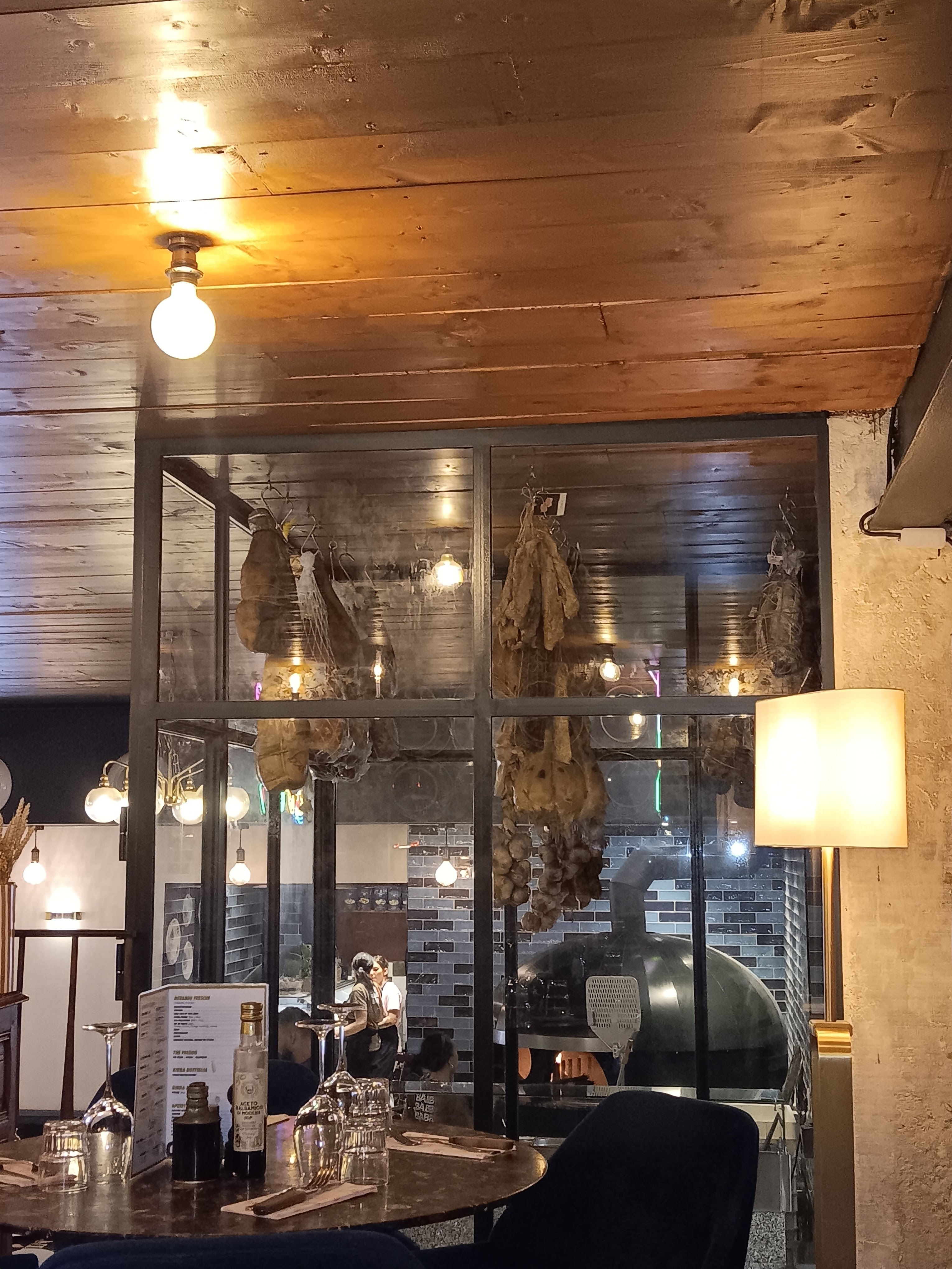 Testée ce samedi soir. Lieu très beau décor. Tables un peu proches les unes des autres les jambons qui sèchent donnent envie d'y goûter Cuisine pris capriccio de poulpe parfait pâtes aux fruits de mer palourdes moules gambas et couteaux cuisson parfaite pâtes al dente Pâte à la carbonara enfin. Les vraies sans crème fraîche Tiramisu parfait Service professionnel et sympathique En soirée du samedi soir beaucoup de monde réservation nécessaire Les prix sont assez hauts mais la qualité est là