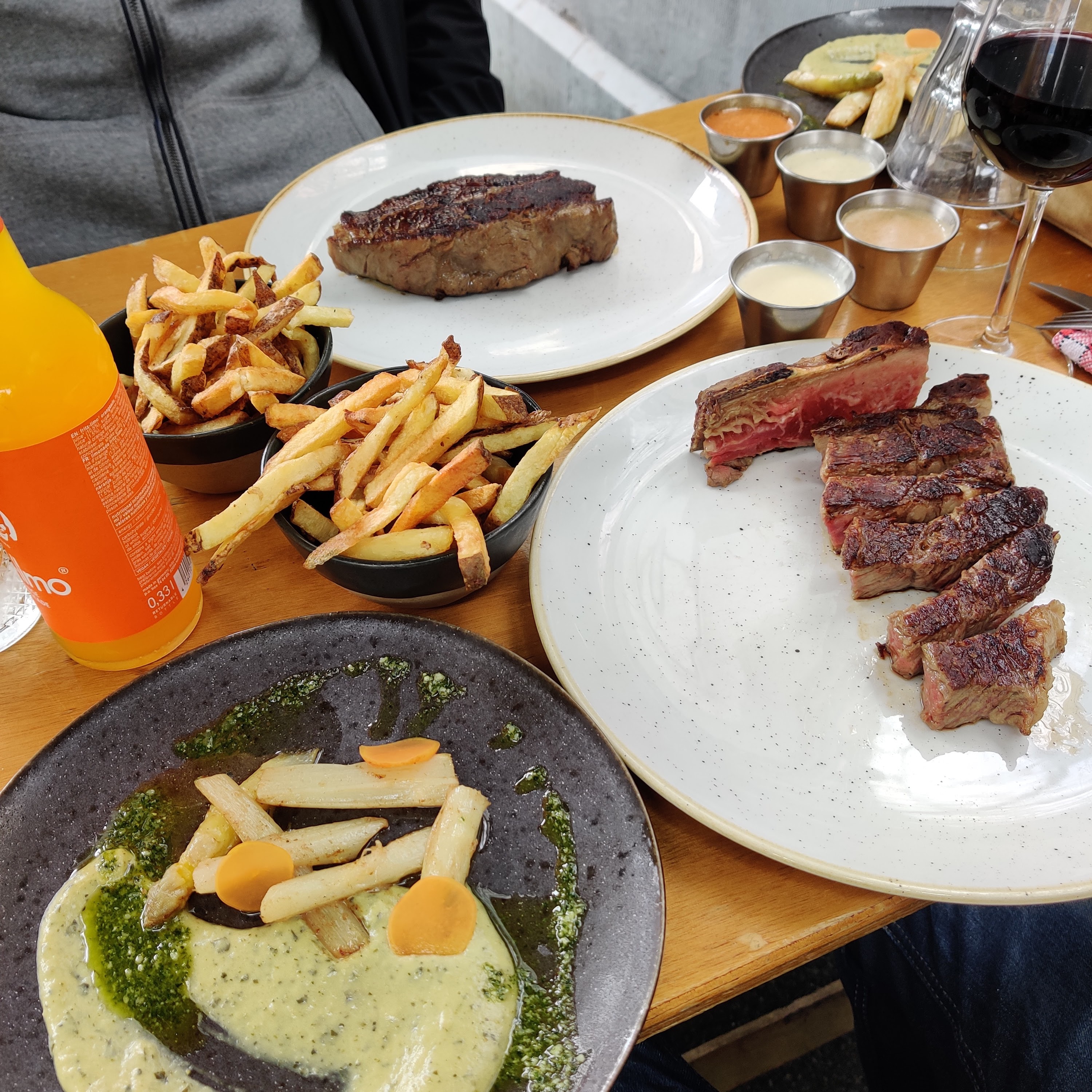 La viande était excellente. La cuisson correspondait à ce que j’avais demandé et le produit était de bonne qualité. Les frites étaient également très bonnes. Le personnel était très sympathique et ouvert à la conversation. Le gros problème était l’attente, la viande était bonne mais tiède et nous avons attendu plus de 30 minutes deux desserts. Cette longue attente a vraiment terminé le repas sur une mauvaise note.