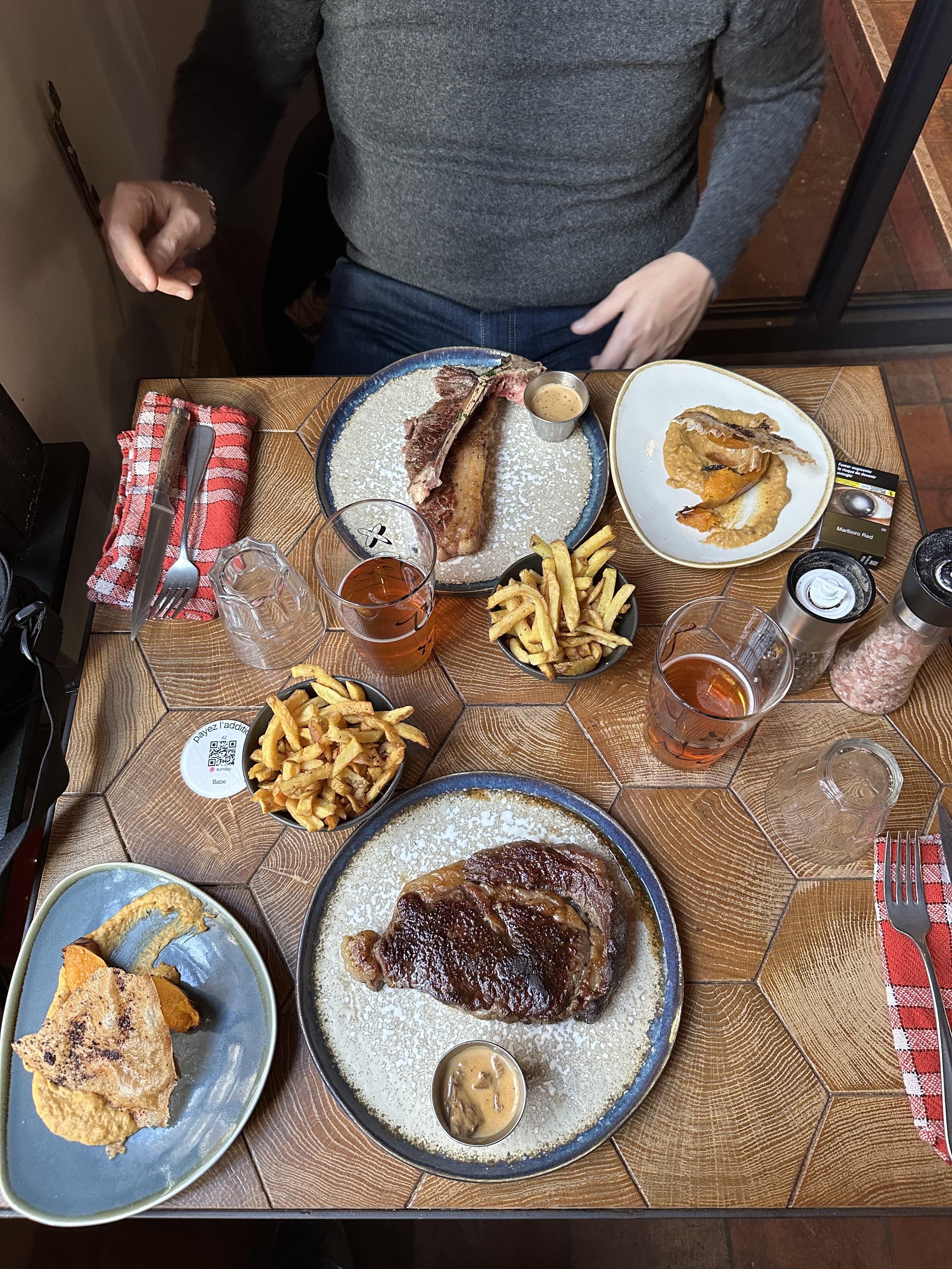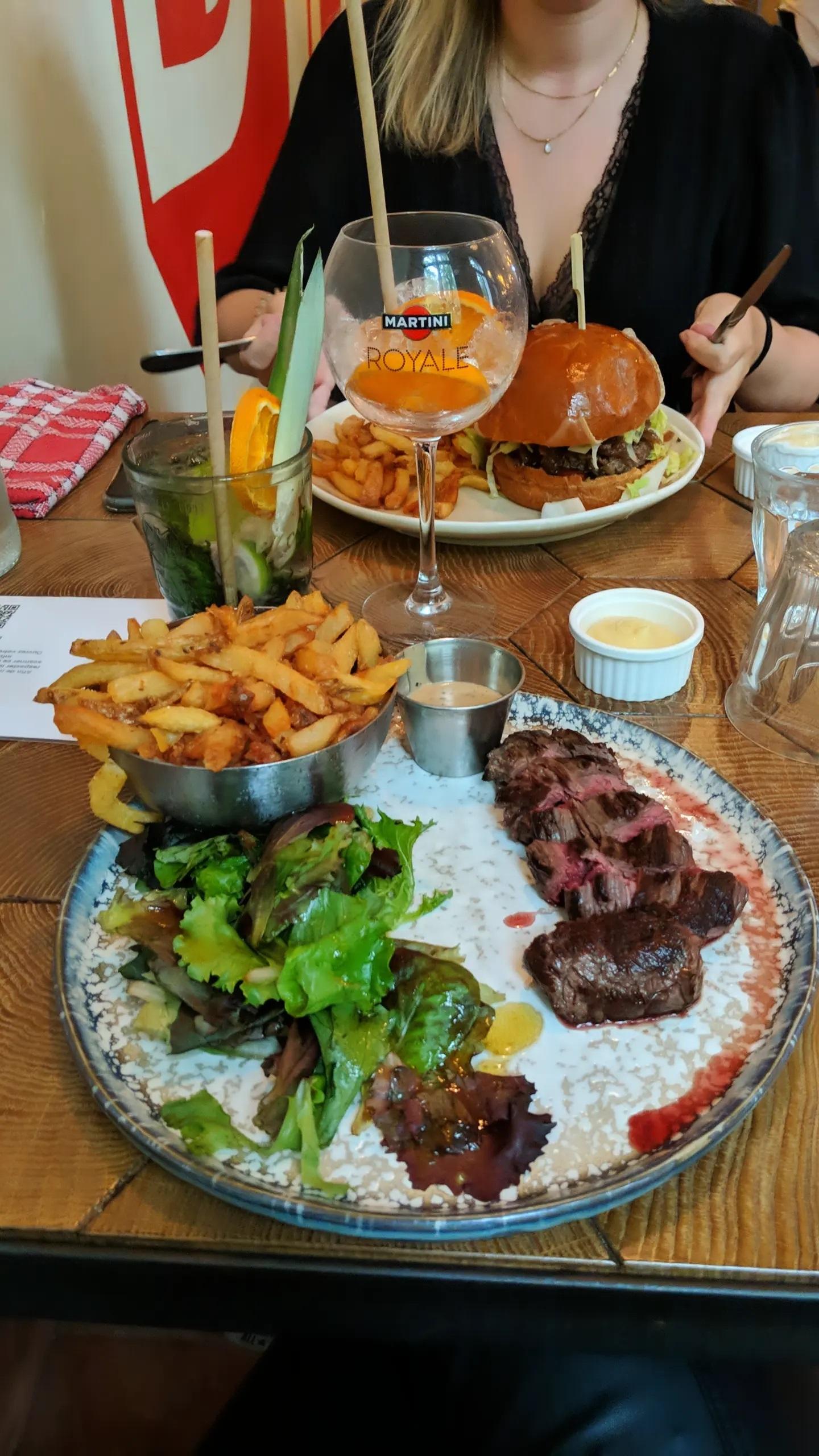 Nous nous sommes régalés. La viande était vraiment très bonne, savoureuse, tendre, saignante mais grillée, avec juste ce qu'il faut de gras pour une belle générosité en bouche. La petite entrée chaude avec une petite bière pression pour faire apéritif était idéale. Notre serveuse a pris le temps de répondre à chacune de nos questions, quitte à aller se renseigner pour pouvoir correctement nous répondre. Les tarifs sont variés, ce qui permet à chacun de s'y retrouver. Clou de la soirée, une avalanche improvisée de cocktails depuis l'escalier du premier étage ! ... En vrai, le gag du serveur trébuchant avec son plateau rempli de verre fait toujours rire, mais heureusement qu'il a géré pour que seul les boissons ne tombent, et pas les verres... Bref, je recommande, et je reviendrai !