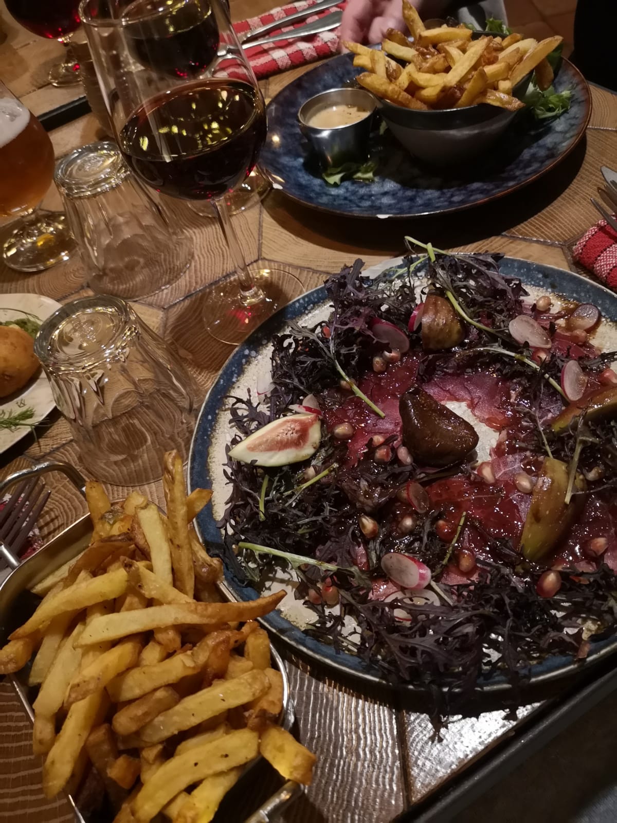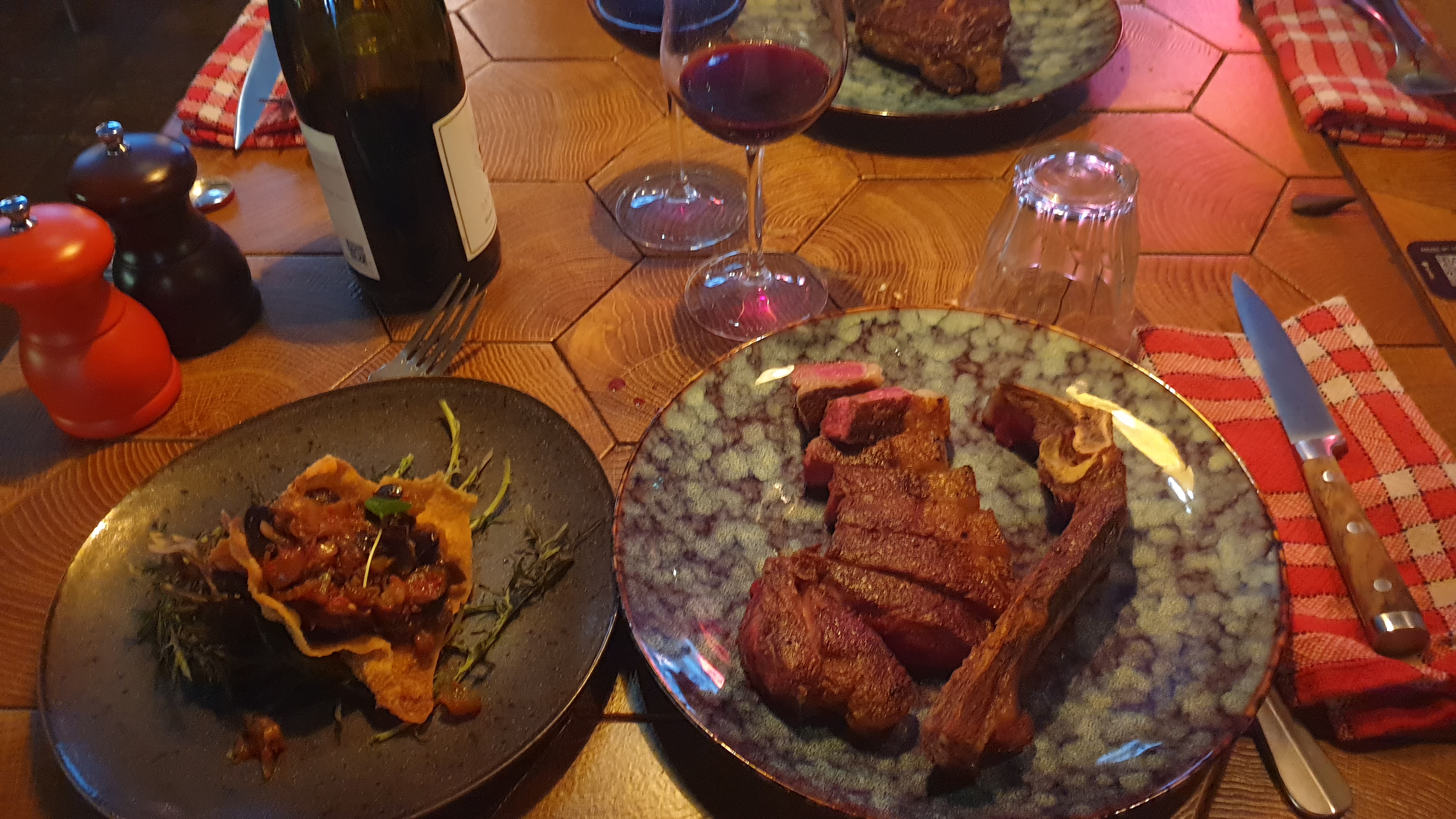 La soirée avait bien débuté avec des entrées originales et bonnes (même si une entrée a du être réclamée car oubliée). Ensuite le service s'est détérioré, nous avons attendu plus d'une heure pour avoir le plat... Certains d'entre nous partagions un morceau de viande à 149 euros. Cela ne nous semblait pas être le morceau de viande attendu, beaucoup trop de gras et trop peu de viande pour 3. Nous demandons à la serveuse. La serveuse va dans notre sens en disant que cela n'est pas normal... Une responsable nous propose deux supers morceaux de viande pour compléter que nous demandons saignant (nous apprécions le geste). Sauf que nous ont été servi des morceaux gelés a l'intérieur. Chaud a l'extérieur. Beaucoup trop cuit. Des morceaux qui ont été clairement réchauffés.... Nous nous plaignons et finalement nous aurons une ristourne sur le plat (149-30 euros je crois...) qui a mon sens n'était pas à la hauteur des erreurs faites. Peut-être était ce à cause du match de foot que tout était confus, long et avec des erreurs ? Les entrées étaient bonnes c'est déjà ça...