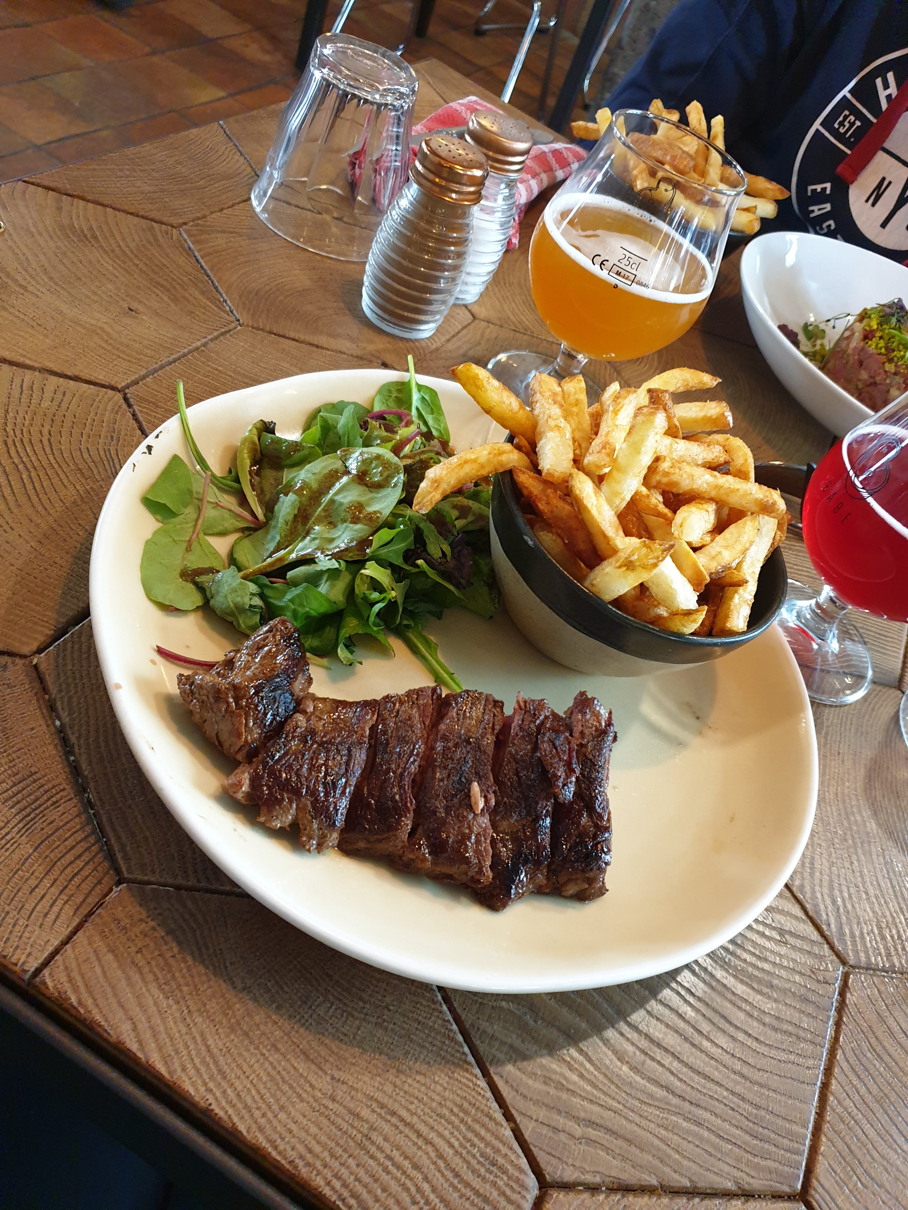 Joli cadre, plats goûteux, l'os à moelle était vraiment délicieux. La bavette très tendre (très belle cuisson) et une excellente sauce maroilles avec des frites fraîches.