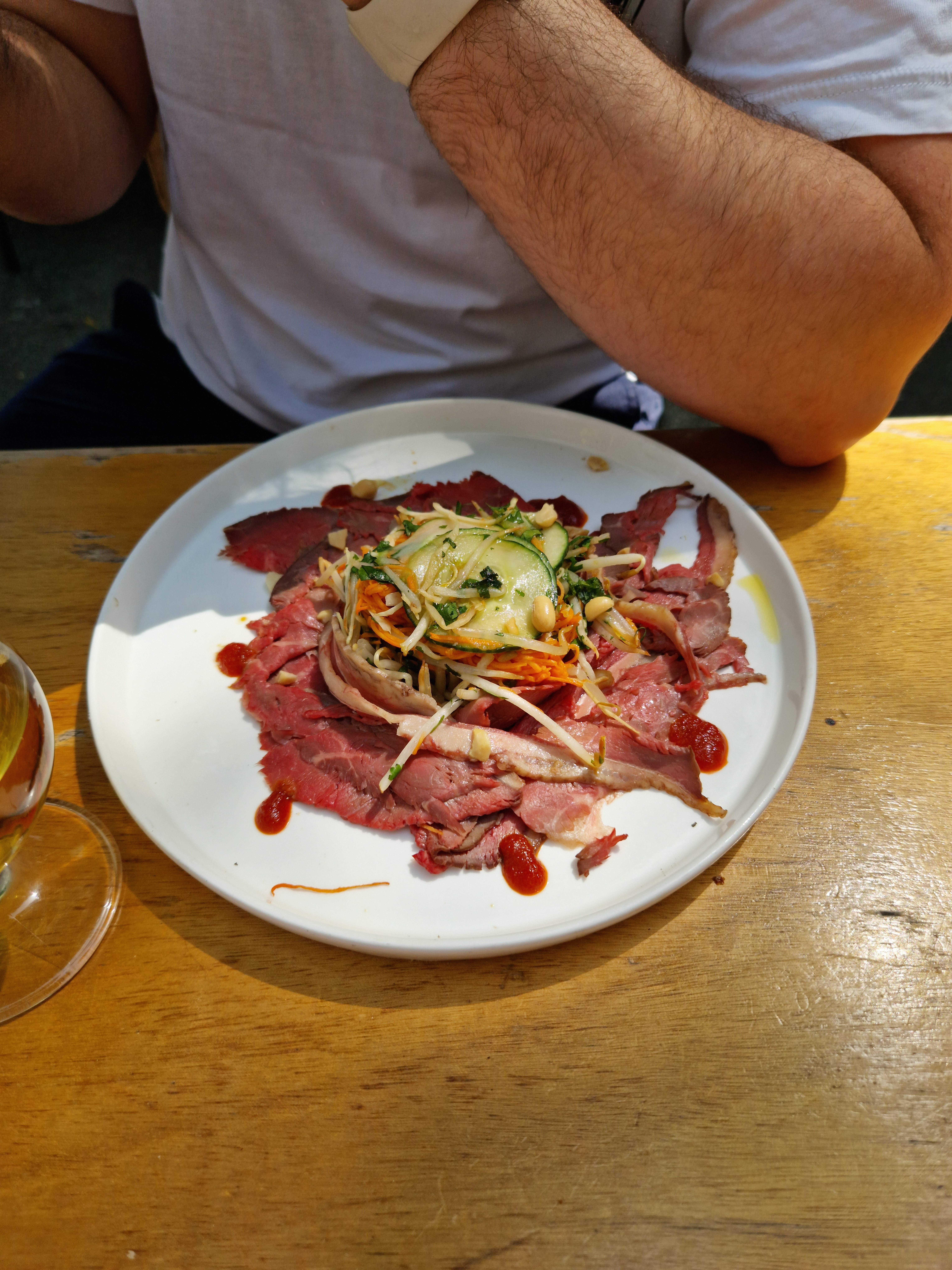 Terrasse à l’ombre pendant l’après midi, ce qui est un vrai plus pendant les chaudes journées d’été. Service très pro. Vin abordable. Très belle déco intérieure.
