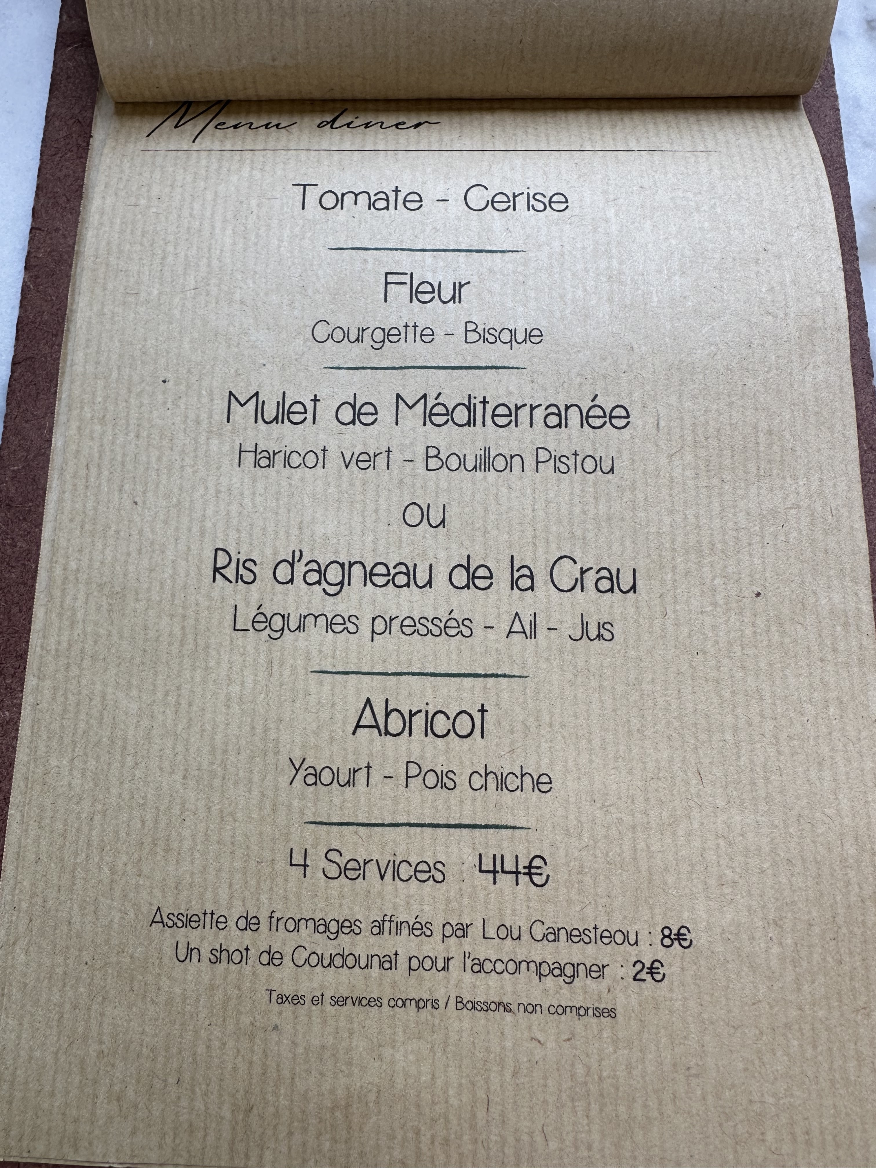 Jeune couple qui a ouvert ce restaurant en Juin, nous y sommes arrivés par hasard et nous n'avons pas regretté. Le concept du menu unique nous aimons beaucoup, une entrée, un dessert et le choix entre l'agneau de Crau ou du rouget en plat avec possibilité de prendre du fromage également. L'entrée betterave raifort était super, l'agneau fondait en bouche et le dessert surprise poire noix très bien. Les plats sont joliment présentés , originaux, inventifs et les saveurs parfaites bien dosées. Le rapport qualité-prix est exceptionnel. Nous étions sur la terrasse à l'ombre c'était juste parfait. Ambiance détendue et sympathique avec les autres clients tout le monde se régalait. N'hésitez pas vous pouvez y aller les yeux fermés.