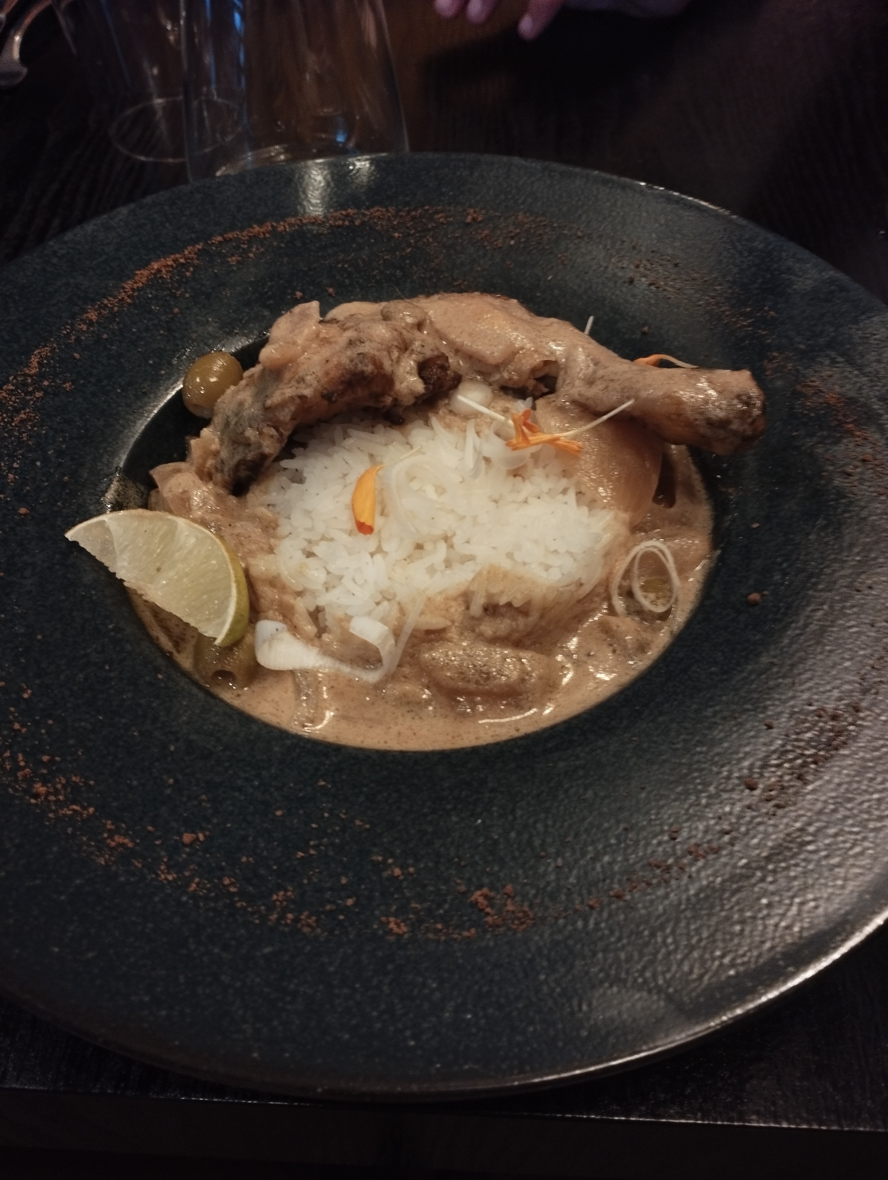 Deuxième déjeuner toujours aussi gourmand et savoureux. Des épices qui permettent de voyager au-delà des plats traditionnels proposés. Le menu du midi à 15€00 est si copieux que nous n'avons pas pu découvrir les desserts^^ L'ambiance sonore participe au changement de culture. Les différents service d'assiettes colorées et d'ardoises servent à merveille la mise en valeur du travail soigné du cuisinier. La finition par une fleur de pensée comestible semble être la signature. Merci au chef cuisinier de nous proposer cette cuisine à La Roche sur Yon et à la responsable du service pour son accueil et sa disponibilité impeccable. A noter : le fumage, notamment de la chair de poulet au feu de charbon est exceptionnel pour le goût apporté.