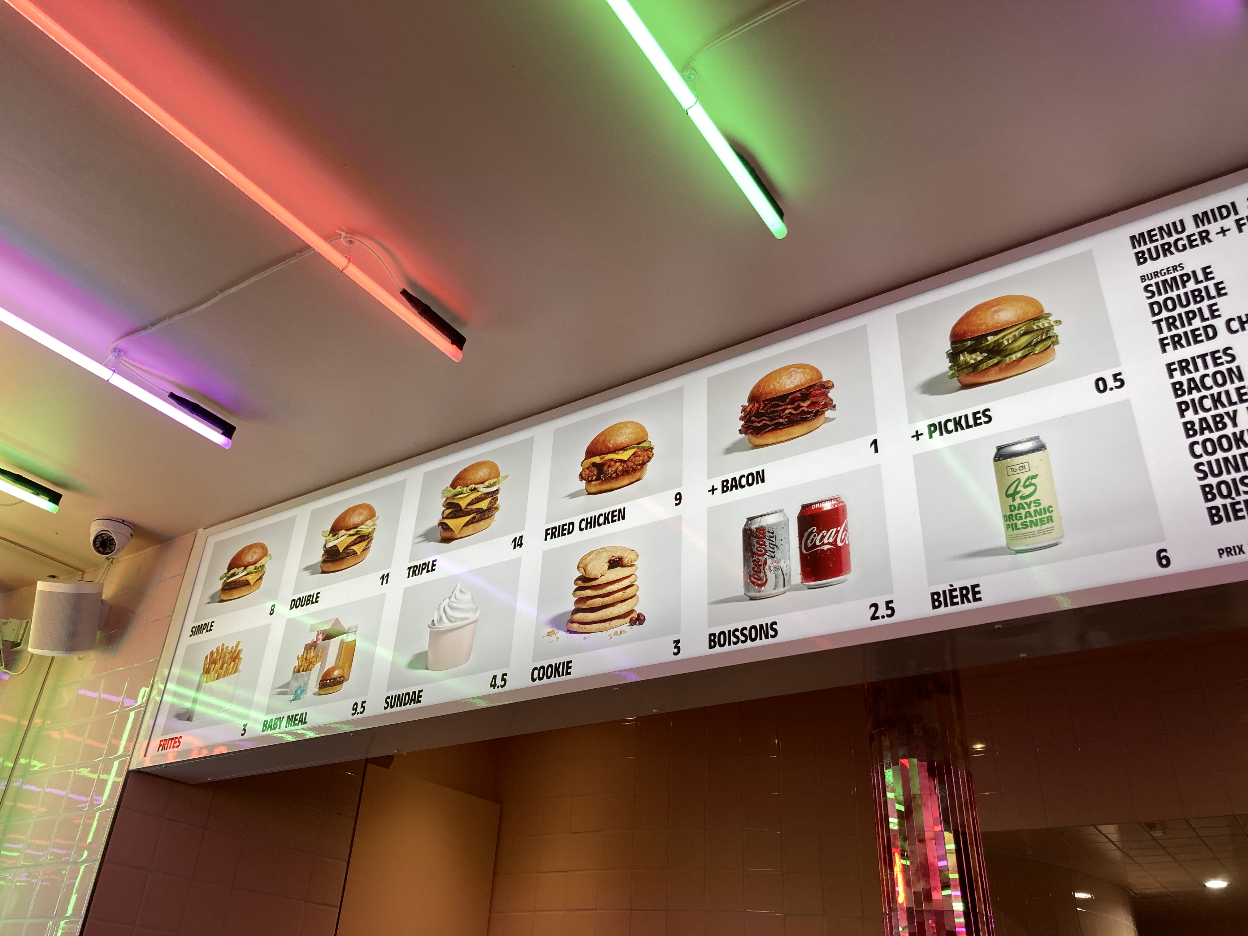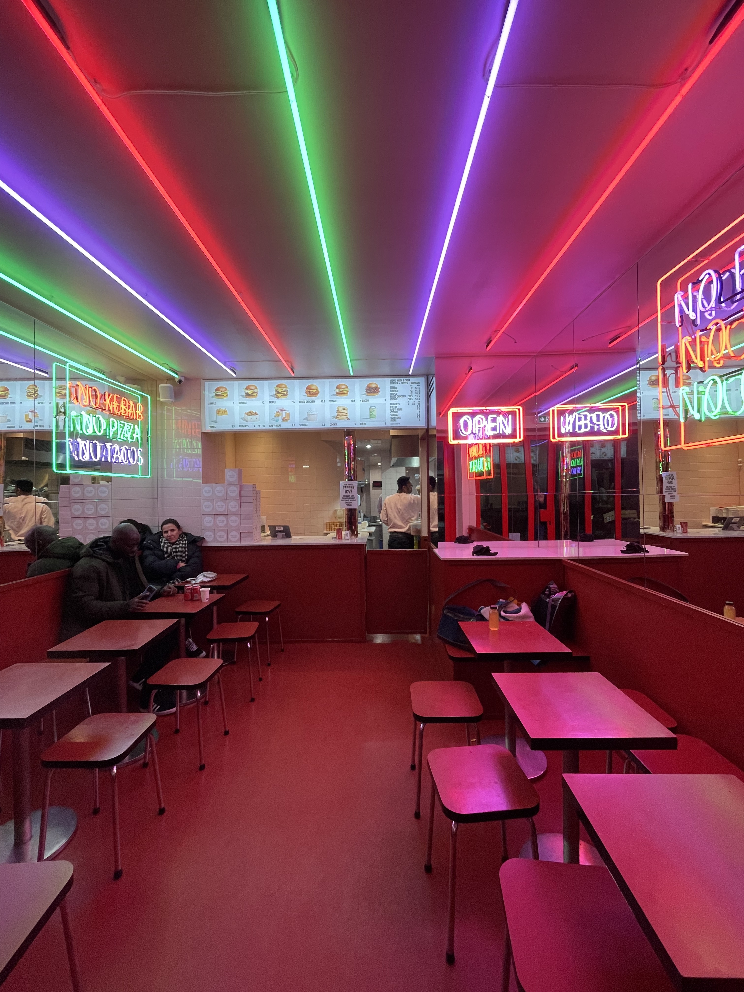 malgré ce que disent certaines critiques, c'est un excellent burger smash - vos choix sont du bœuf, du poulet ou des légumes - du bacon supplémentaire ? le personnel est super sympa et parle français et anglais ! la décoration est toute néon avec des miroirs — c'est un endroit génial qu'il faut absolument essayer si vous cherchez une bouchée rapide ! Je vous conseille de prendre le double ou le triple burger car cela ne vous assommera pas : la portion de frites était énorme et les nuggets sont excellents ! Les petits pains sont briochés et ajoutent une saveur beurrée au repas – tout va bien.