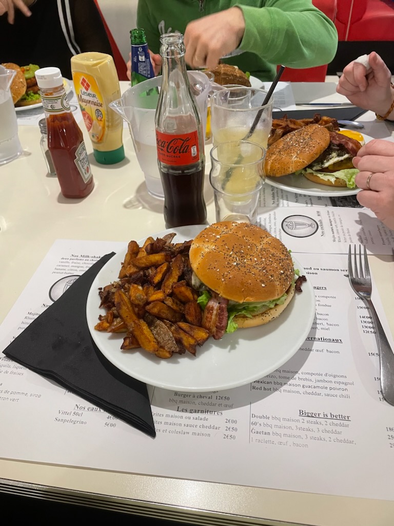 Ambiance américaine des années 60 à Rennes 👍🏻 Belle ambiance, accueil très chaleureux et qualité au rendez-vous! Je me suis régalée avec le Spanish burger et sa compotée d'oignons, un vrai steak, du chorizo, fromage fondu accompagné de frites Maison. Je recommande l'aventure très copieuse Le petit plus, le parking Hoche est tout proche et Métro Sainte à quelques mètres