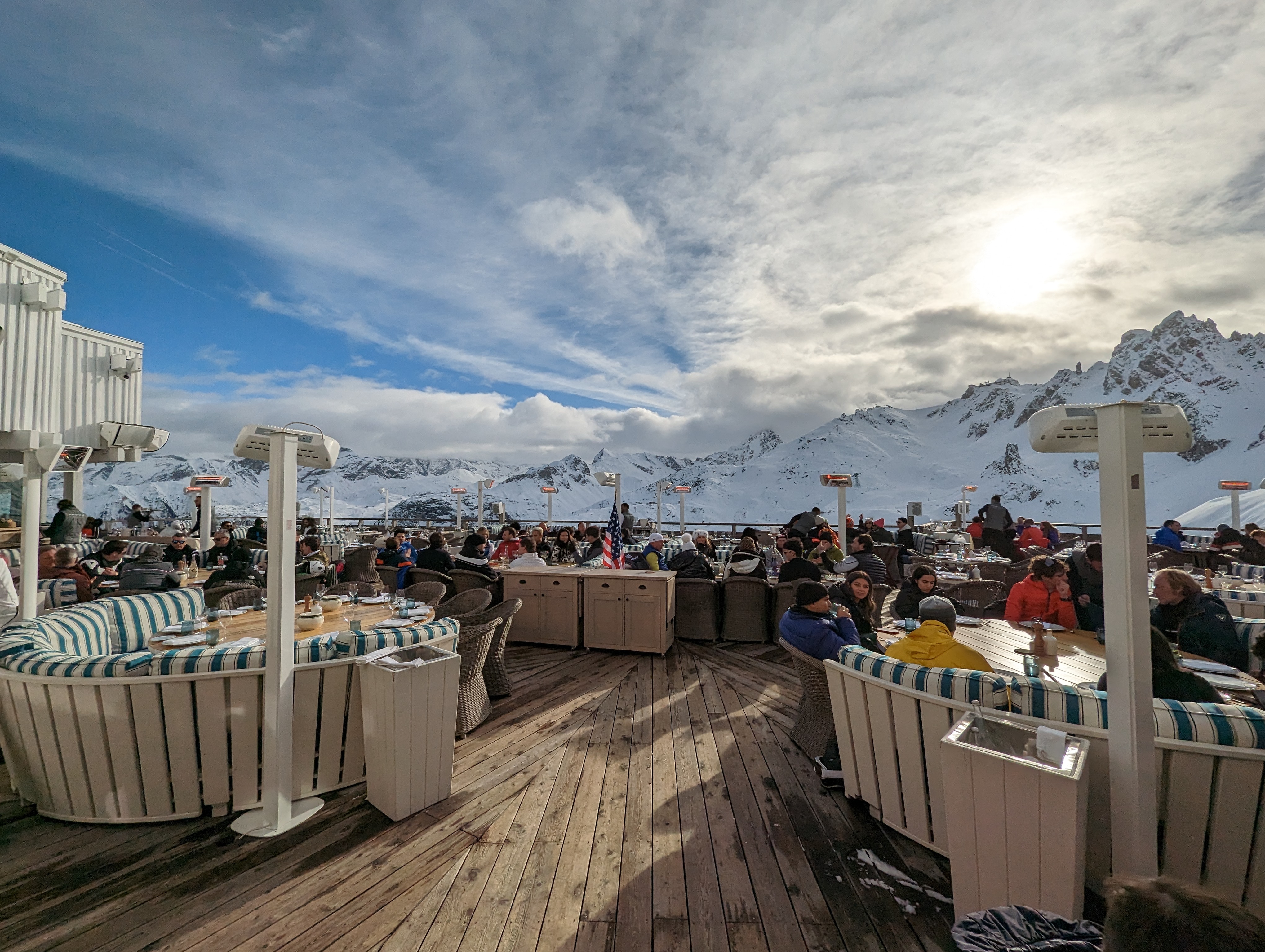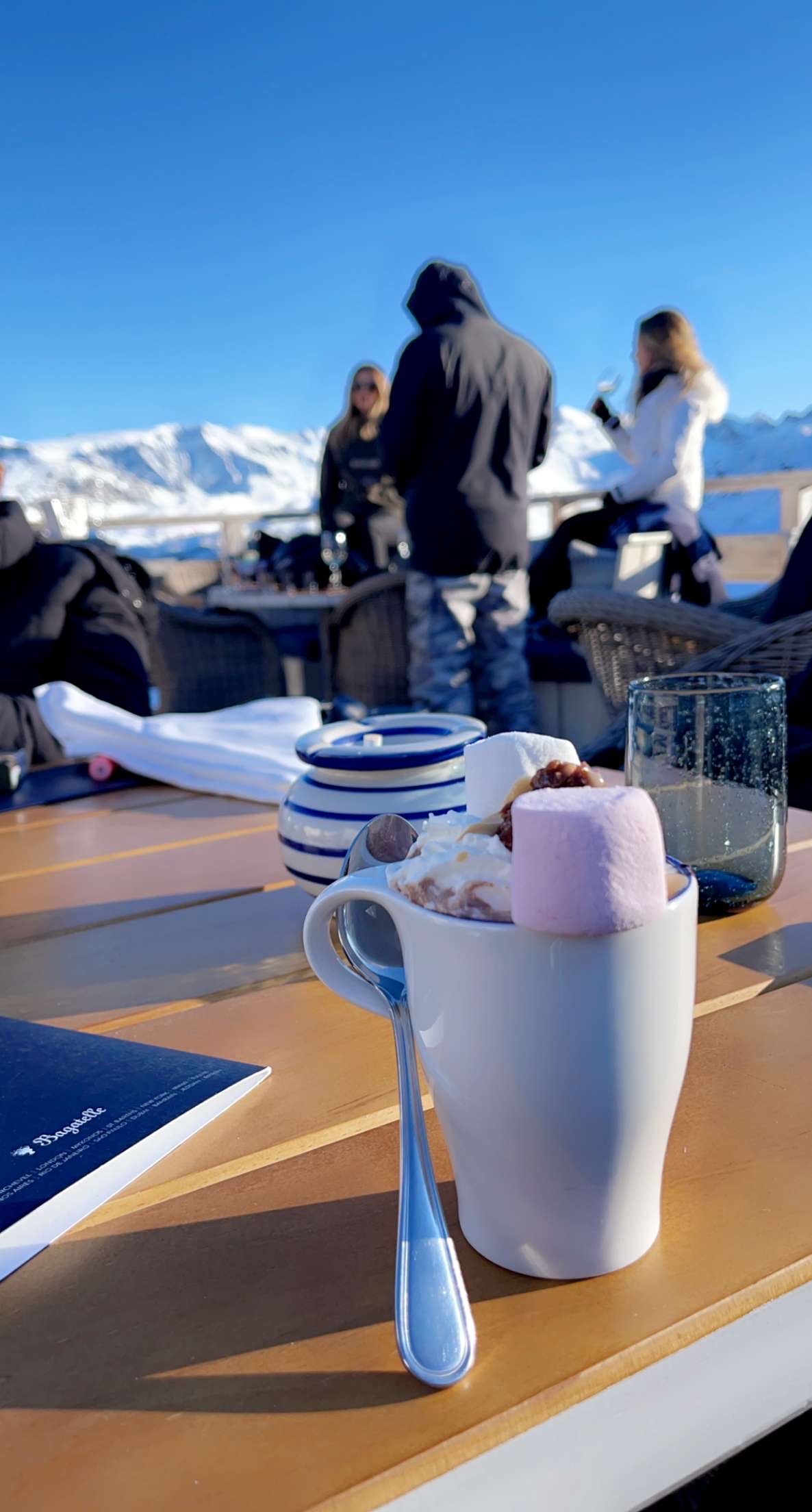 Un des endroits les plus chers de la station. Si vous rechercher un style huppé, vous y êtes, ambiance chic et vue magnifique, parasols chauffants et assises très confortables. Attention aux petits portes monnaies cependant, un chocolat chaud, aussi excellent qu'il soit vous coûtera 11€ et une bière 16€. Je mets cette note car nous avons regretté l'horaire de fermeture trop tôt qui nous précipite vers la sortie avec le personnel qui ne se gêne pas de dire à voie haute qu'il faut ranger la terrasse et bouger les gens devant. Un peu léger pour la note qu'on laisse à l'établissement.