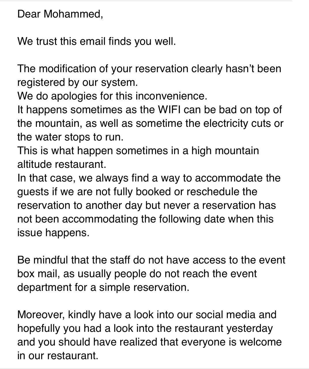 Incompréhensible !!!! Tu appelles pour réserver et il n y a plus de places par contre nous restons privilégiés lorsque nous dépendons des concierges des palaces de Courchevel, cela fonctionne!!!’ C est une honte
