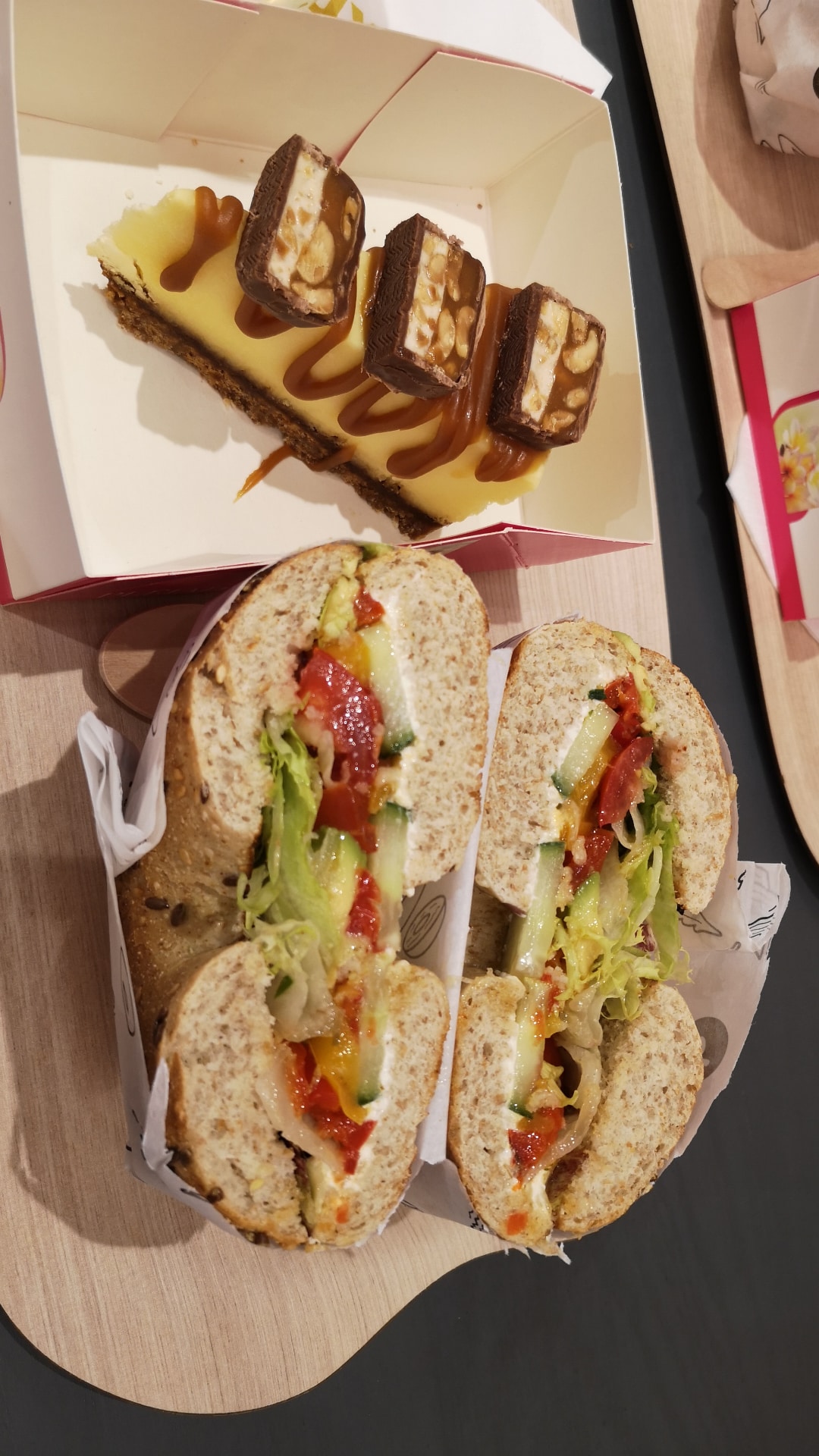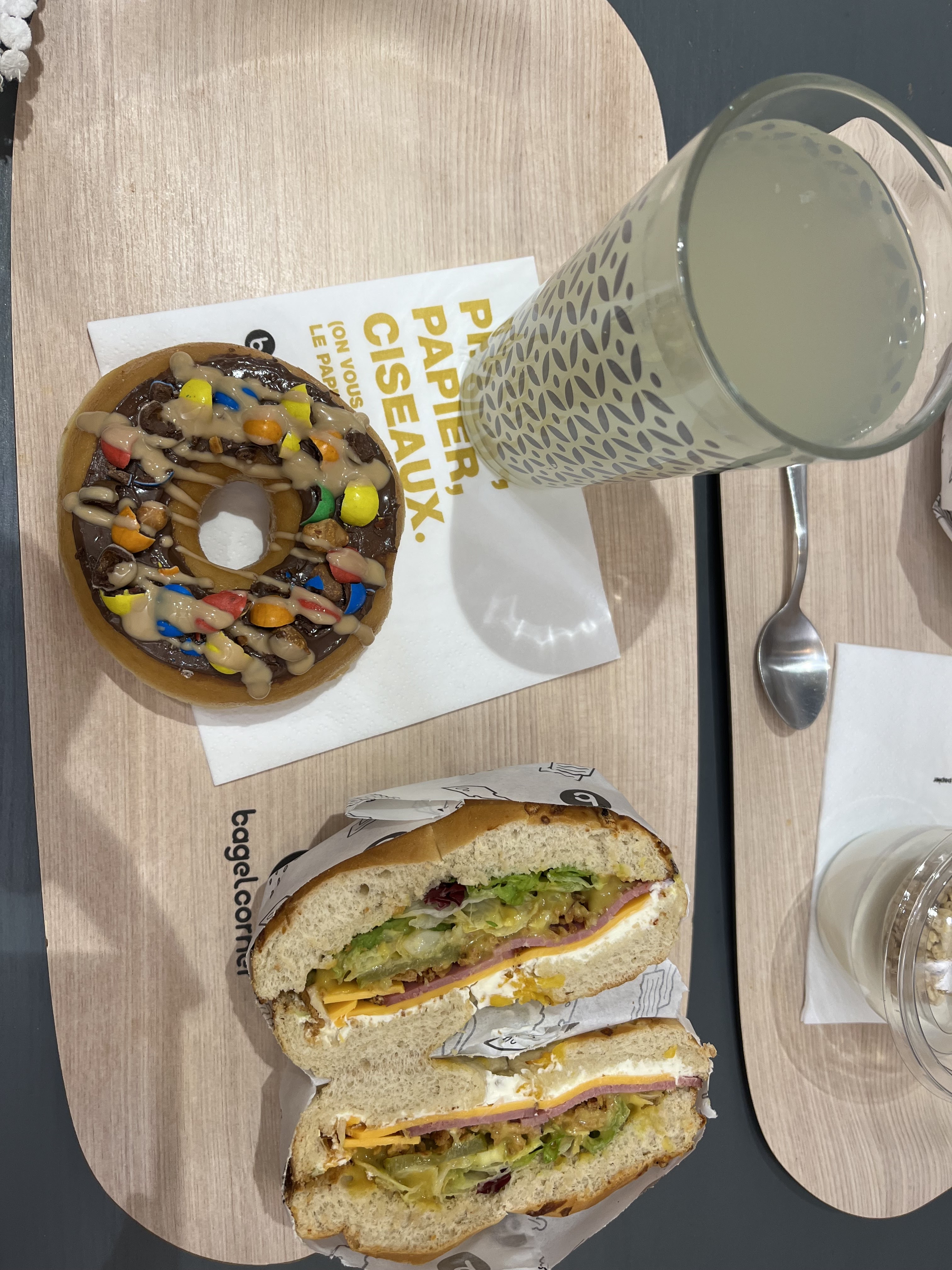 On a pris un menu bagel nordique avec un donut M&M’s, le bagel était très bon (pain chaud au choix), pas mal de saumon fumé et d’avocat et la petite sauce a l’intérieur appréciable. Le donut aurait pu être fourré ça aurait été meilleur mais sinon c’était pas mal. Le bagel Caesar était très bon aussi, goûteux et le cheesecake au chocolat caramel n’était pas trop sucré mais c’est dommage qu’il soit en supplément du menu. Point positif : c’est plus copieux que ce que l’on pense et les ingrédients sont frais. Le rapport qualité/prix pourrait être un peu mieux, le tarif est un peu élevé selon moi. Sinon, le personnel est sympathique et le cadre est assez agréable pour un si petit endroit.