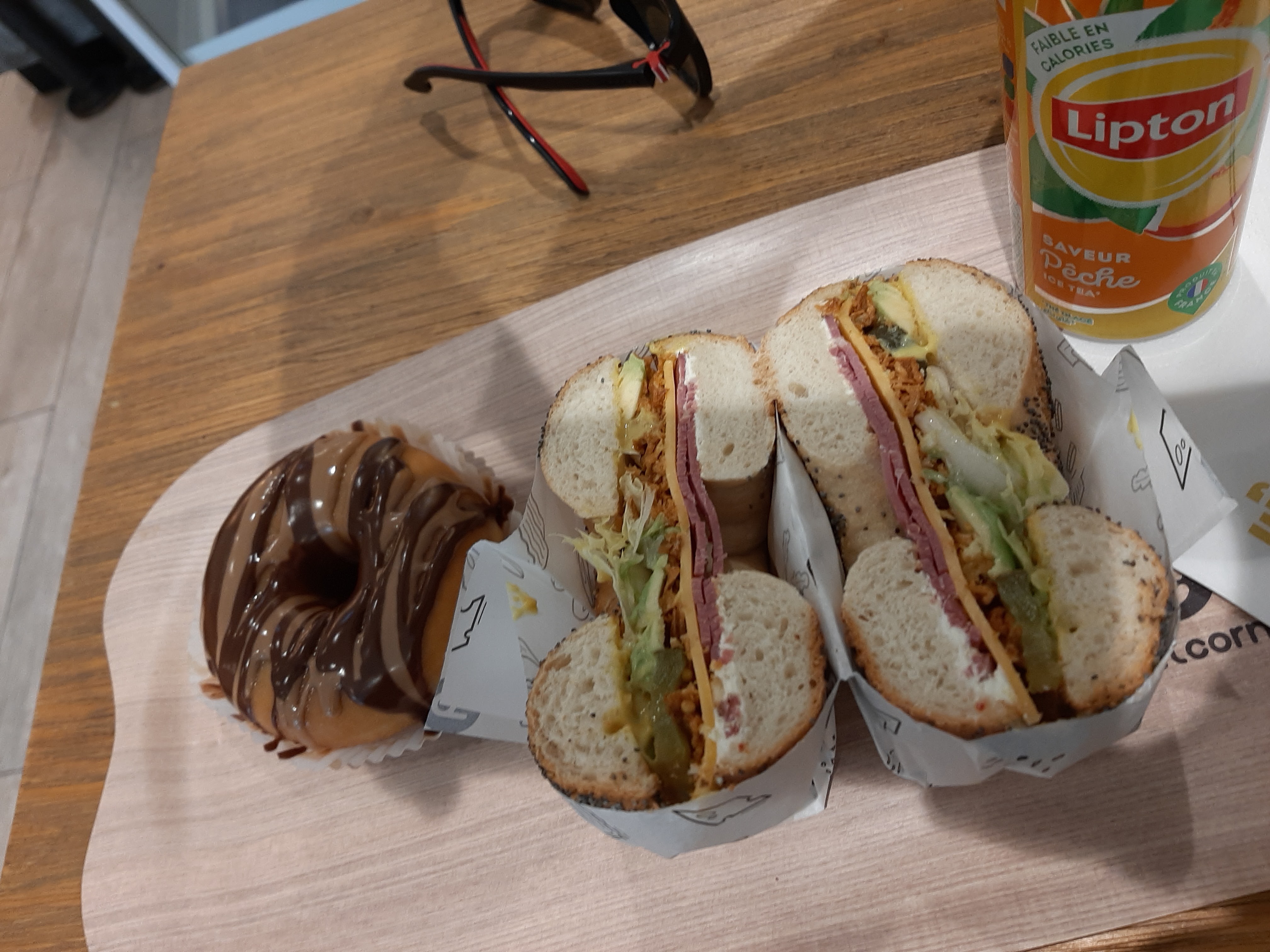 Découverte d'une nouvelle enseigne. J'ai opté pour un new yorkais (pastrami, avocat, cheddar, salade, pickles, oignon frits ). Un régal. Pour les traditionnalistes du bagel, le saumon est aussi confectionné. Une adresse à retenir