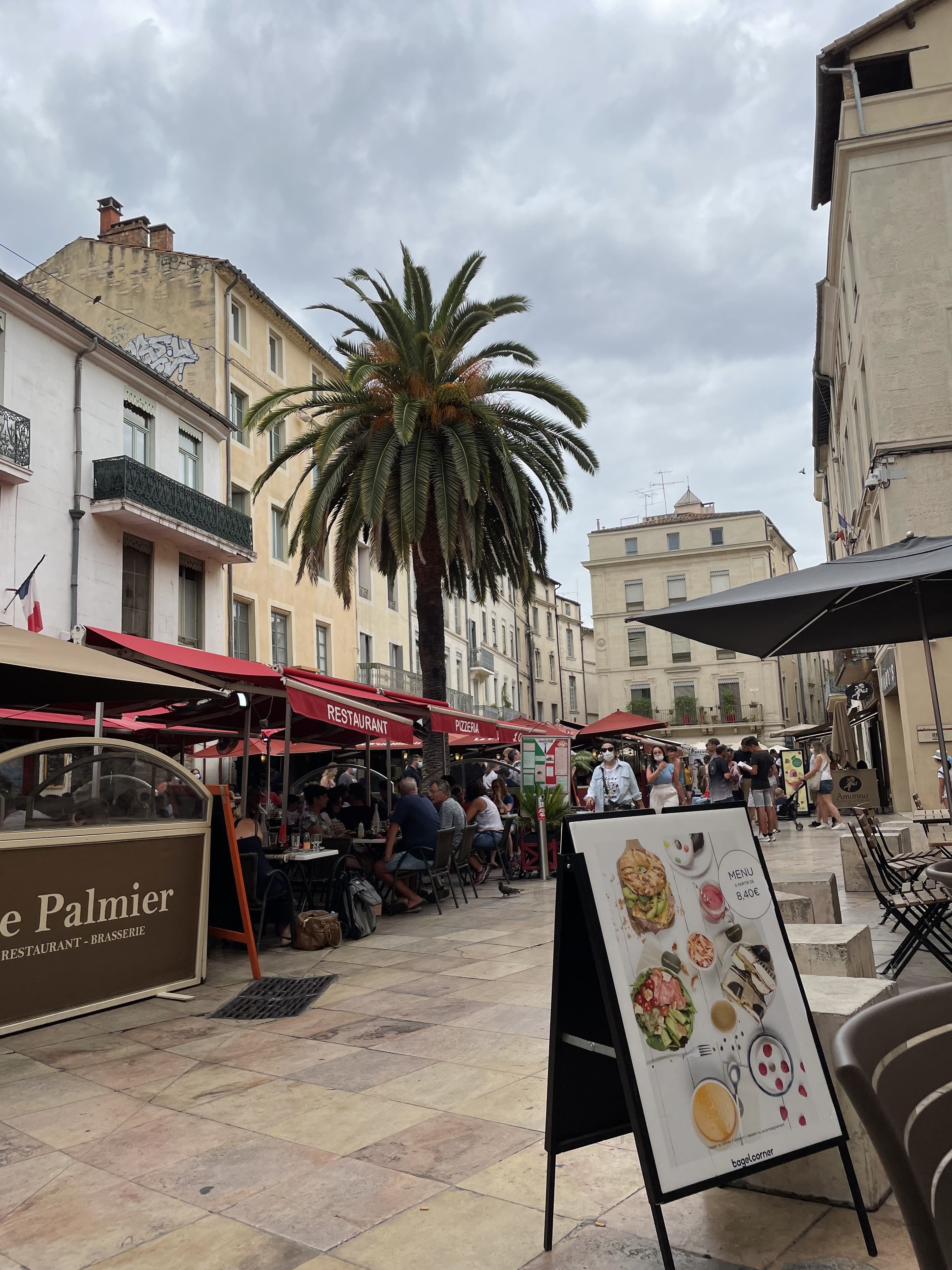 Situé au cœur du Nimes historique, sur la charmante place du marché, excellent bagel fait devant vous, avec le sourire par l'équipe et la bonne humeur! Super !