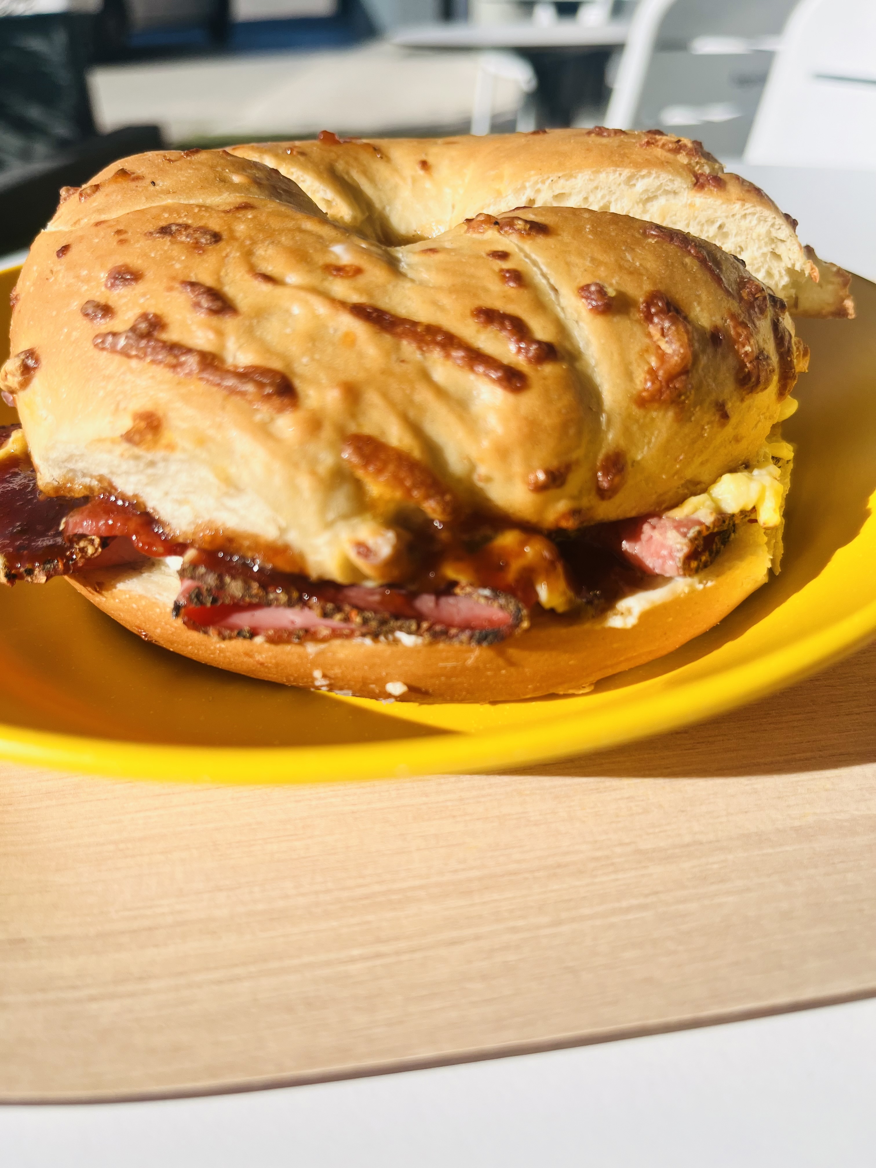 Cliente depuis l'ouverture, je n'y suis plus allée depuis environ 1an car travaille plus à côté, et aujourd'hui, passant par là, je vais tout naturellement chercher un excellent bagel pour déjeuner, mais qu'elle déception ! Un bagel sec, les ingrédients n'ont aucun goût, sans saveur, des tomates sans parfum en plein mois d'août comme est-ce possible ?une salade flétrie, un pastrami sans goût, 3 boulettes de mozza qui semblent perdues dans le sandwich, ma foi ! Grandement déçue ! Mais que s'est-il passé ? Ça se dégrade ou c'est pour les vacances que c'est n'importe quoi ?