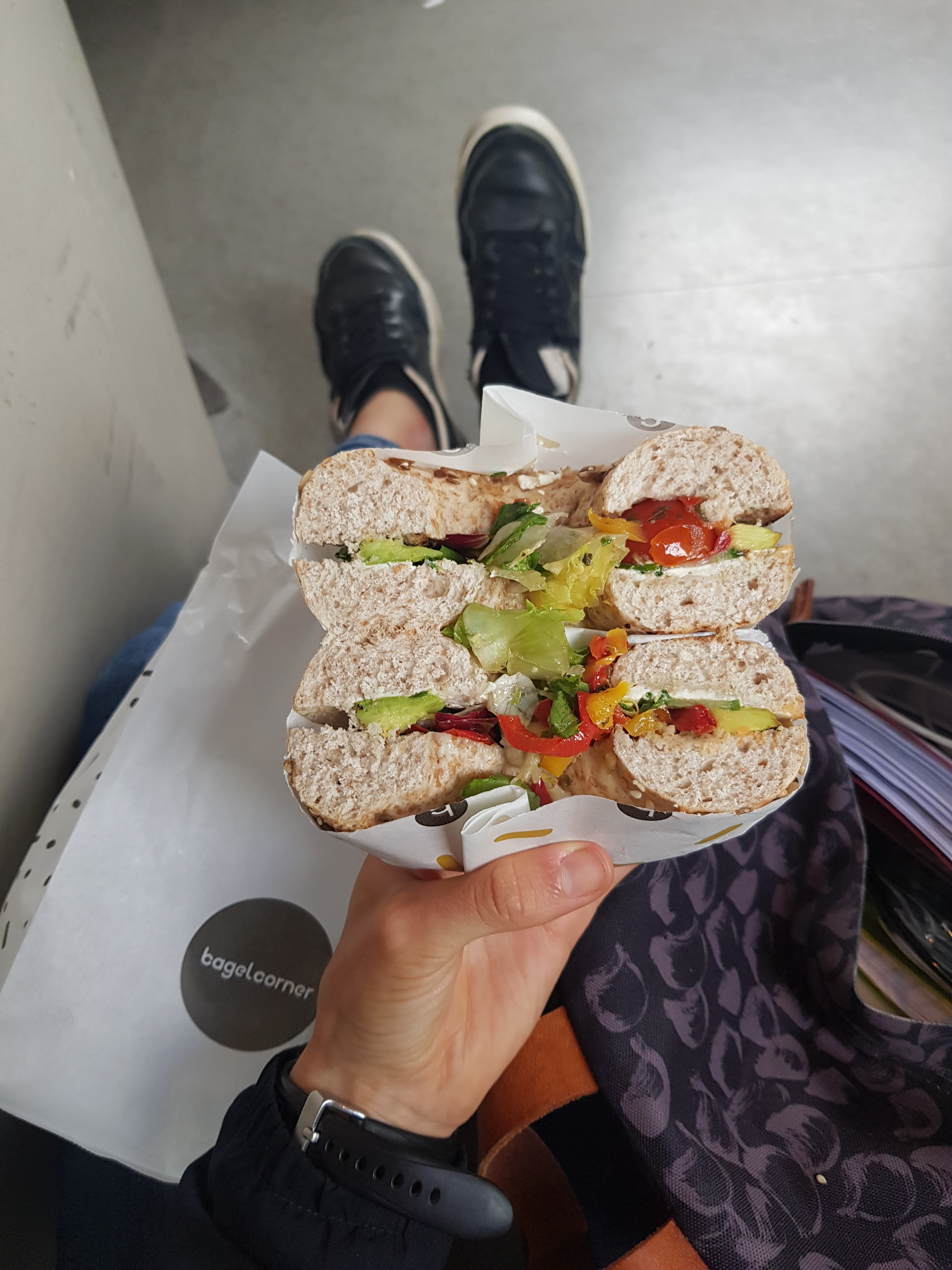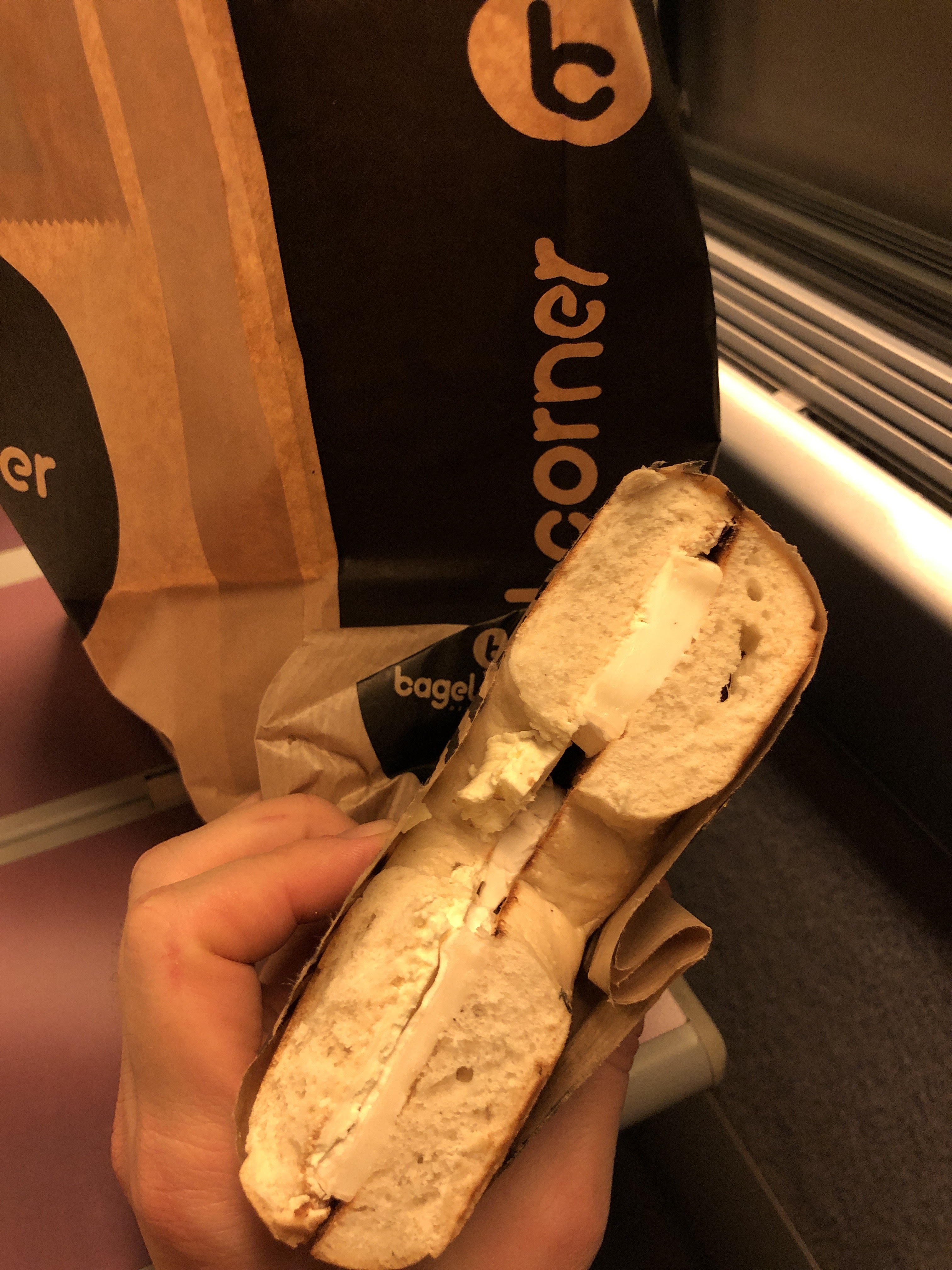 Bagel Corner emplacement idéal dans la gare pour emporter notre plat dans le train j'étais déjà allée une fois le bagel était vraiment délicieux 😋 mais la deuxième fois que j'était le bagel était sec et le pain dur en plus personnel un peu désagréable mais sinon le donuts était délicieux 😋