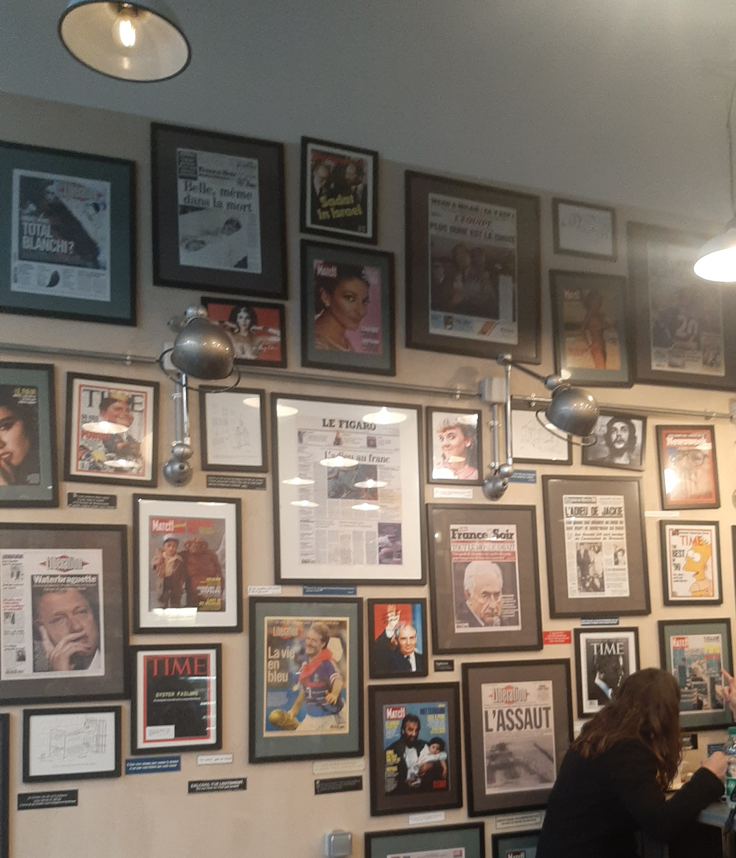 Quelques pâtisseries en présentation mais manque le nom mais surtout le prix. Une jolie déco avec des affiches de magazines. Petite terrasse sympathique