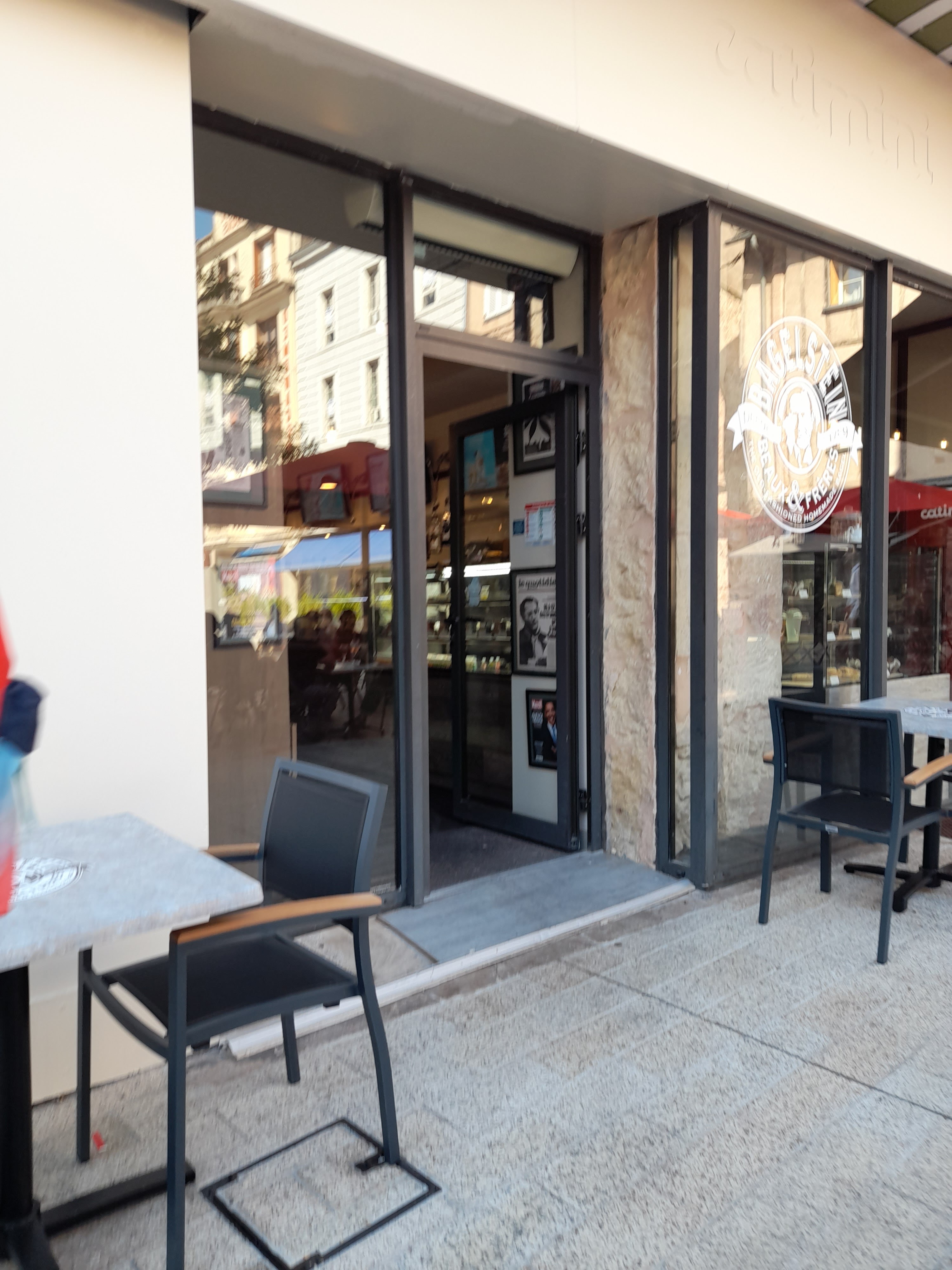 Une valeur sûre! Si vous ne connaissez pas la franchise, ce sont d'excellents bagels, vous pouvez généralement les personnaliser mais les recettes de base sont bien bonnes telles quelles. Par rapport à d'autres Bagelstein, celui-ci propose des frites (délicieuses, et la sauce est effectivement super), et quand je suis arrivé, un peu tôt, j'ai pu admirer tous les bagels déjà prêts en prévision du rush de midi; une excellente initiative que je n'avais pas vue ailleurs! Par contre, pas de version XL des bagels, c'est taille unique (mais perso je trouve c'est suffisant!) Le resto lui-même est très sympa, tout à fait dans le ton Bagelstein, avec plein d'affiches «historiques» de magazines. Il y a également une terrasse donnant sur la jolie place de la Cité. Je suis déjà fan de la marque et cet établissement ne déçoit pas. Et le service est excellent, ce qui est toujours un plus. J'y reviendrais avec joie :)