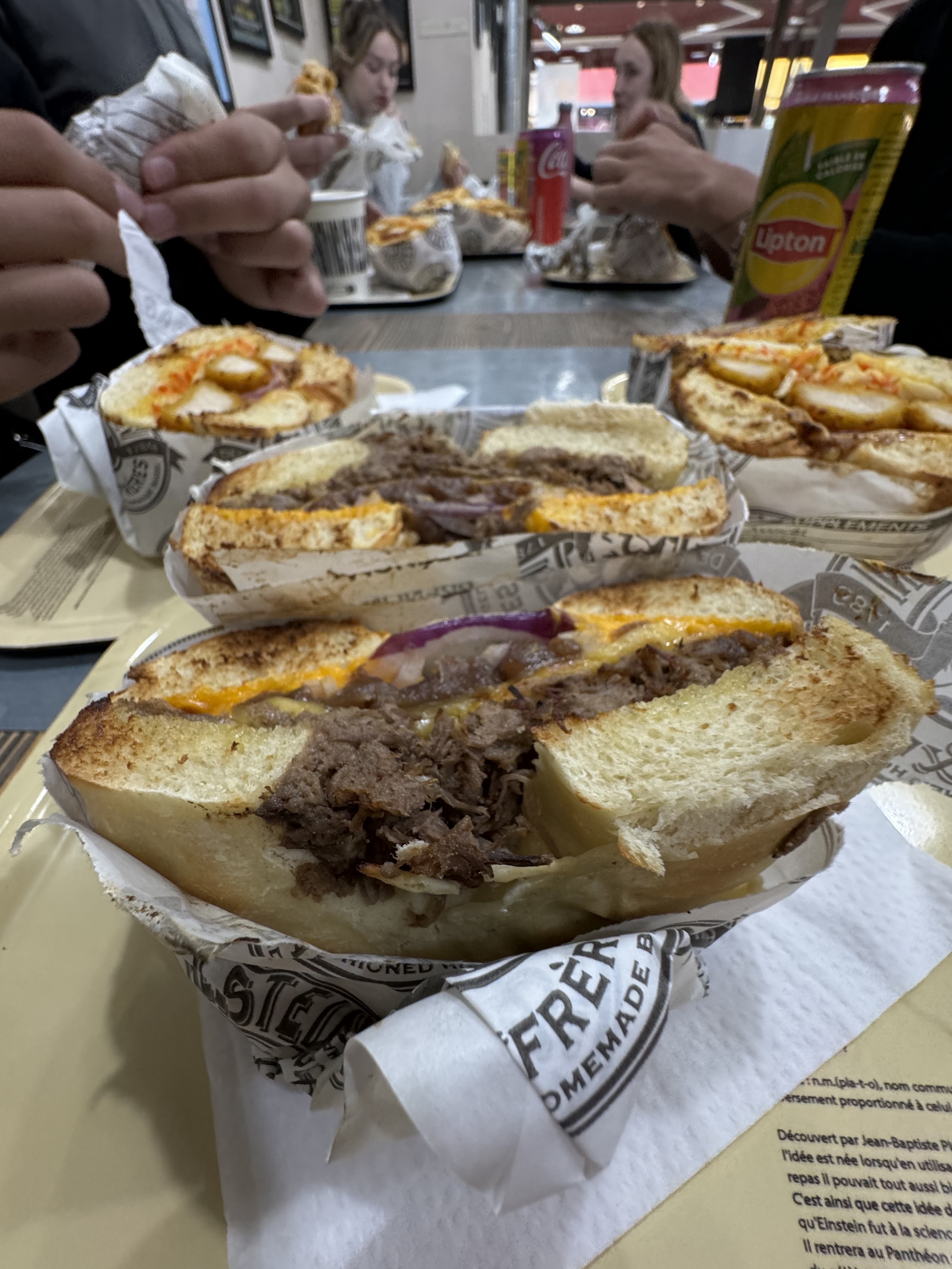 La nourriture est bonne mais le rapport qualité prix un peu élevé. Décor intérieur très sympa. Attention aux règles basiques d’hygiènes, il n'est pas concevable de voir passer une personne du stand de conception des sandwichs au calage de la porte d'entrée avec un morceau de carton puis retourner faire des sandwichs..sans changer de gants plastiques et sans inquiétude... Enfin, le tutoiement des clients c'est pas sympa du tout, on n'est pas ni à Montréal ni à Québec (heureusement j'ai été vouvoyé).. Il faut faire évoluer cela..