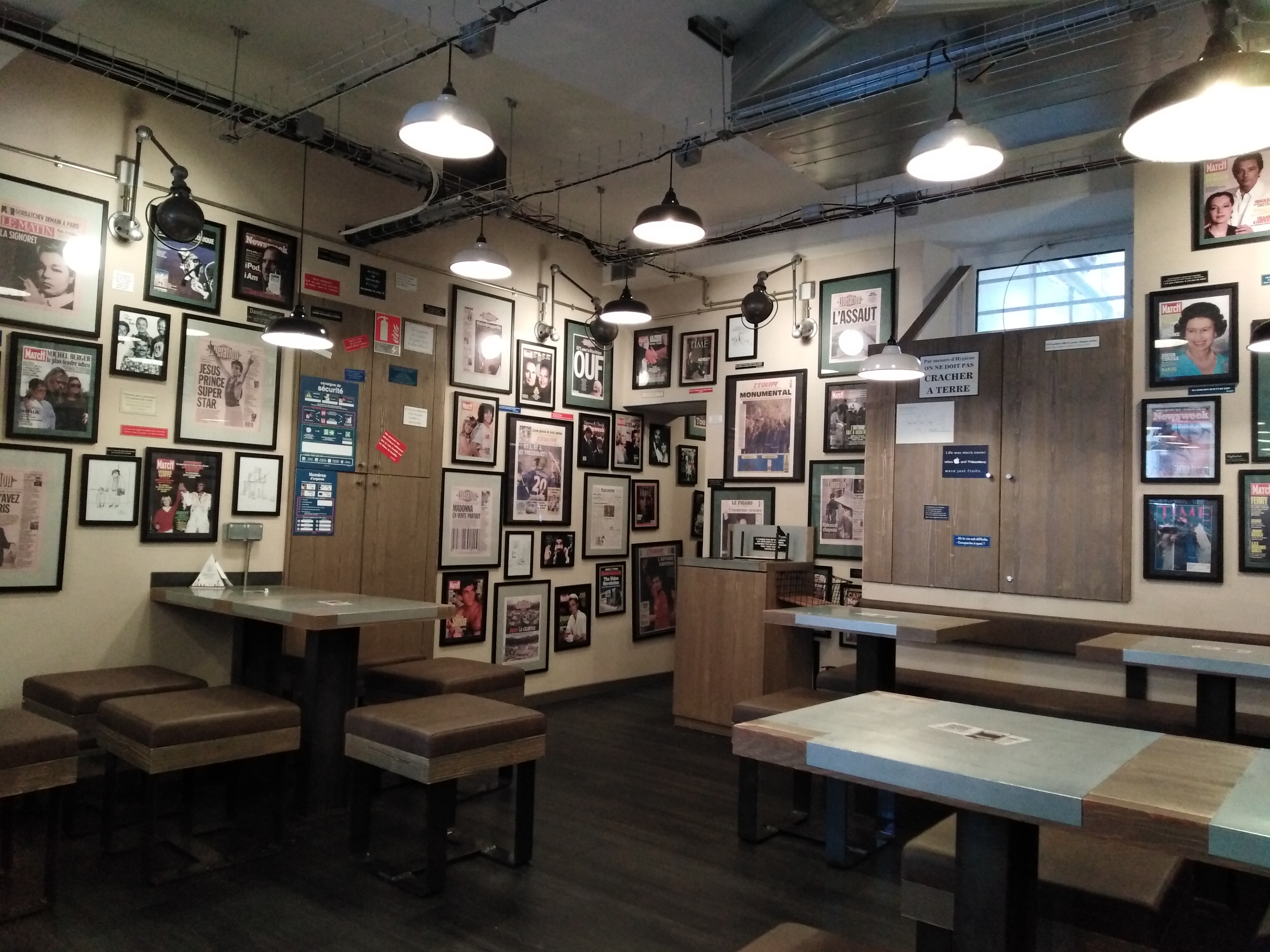 Bonne expérience L ambiance est top avec toutes les premières pages avec les évènements exceptionnels du monde et de la presse. Il y a aussi de bonnes blagues. Un peut déçu par le bagel. Avec toutes ces matières premières, je n' ai pas pû où je me suis trompé de recette, avoir un bagel avec beaucoup de goût. Comme souvent (ce n est pas le cas partout, mais il faut se renseigner), presque tous les produits viennent de la centrale (sauf les oignons et les concombres), dommage mais l organisation, les équipes, seraient chamboulé et les prix aussi ! A retenter.