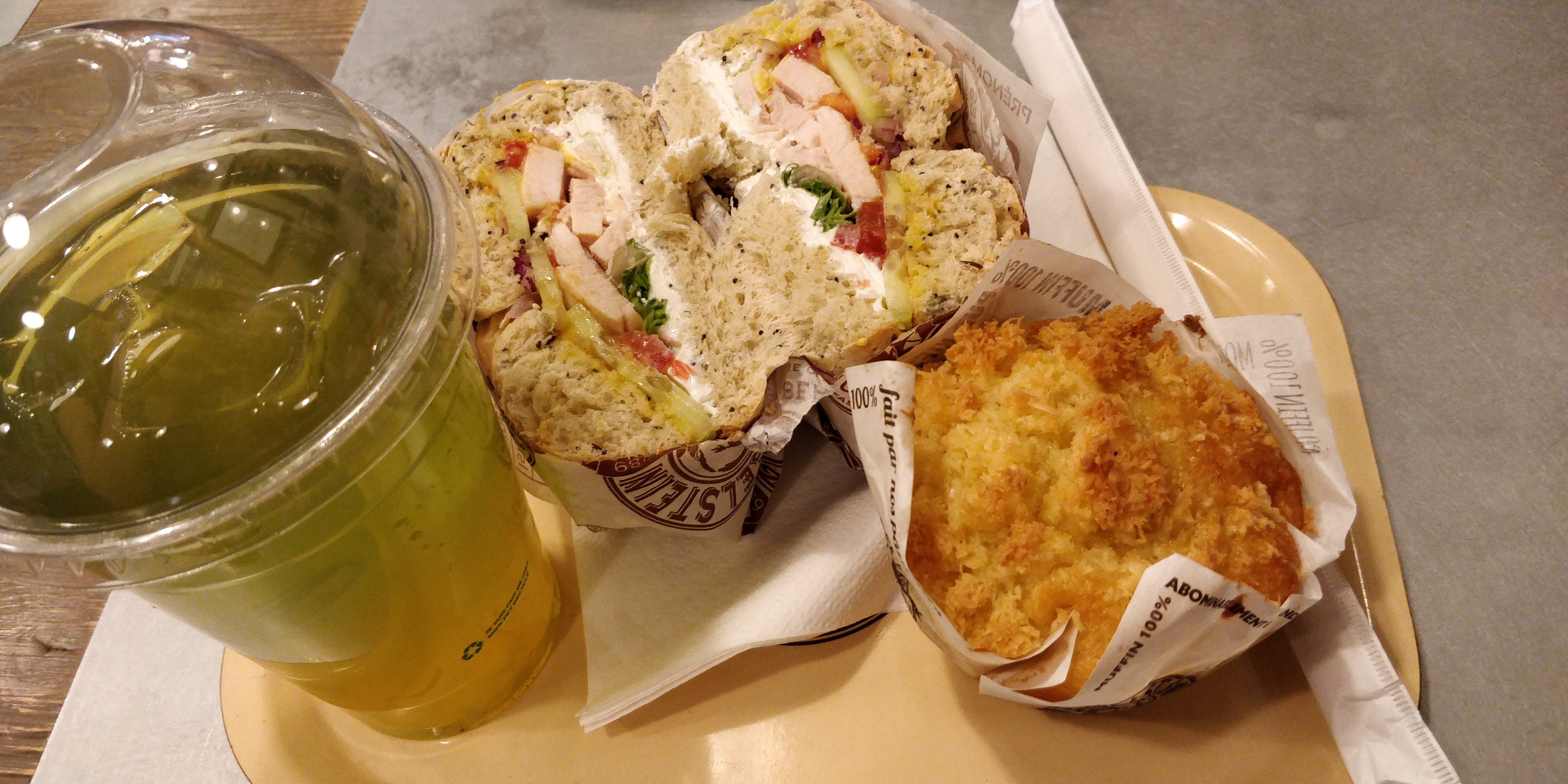 Première fois que je viens dans ce lieu, j’ai croisé son regard près du tableau des menus, offrant des prix aussi moelleux que son pain. Je sentis mon cœur s’emballer et là je compris, c’était le coup de foudre. Je ne pouvais m’empêcher de penser à lui depuis que j’avais passé commande, enfin il me rejoignit avec un plateau et un énorme cookie 🍪il était frais et bien garnis. Je me laissais aller à ma pulsion et le dévorais corps et âme, ce fut mon premier bagel. Incroyable !