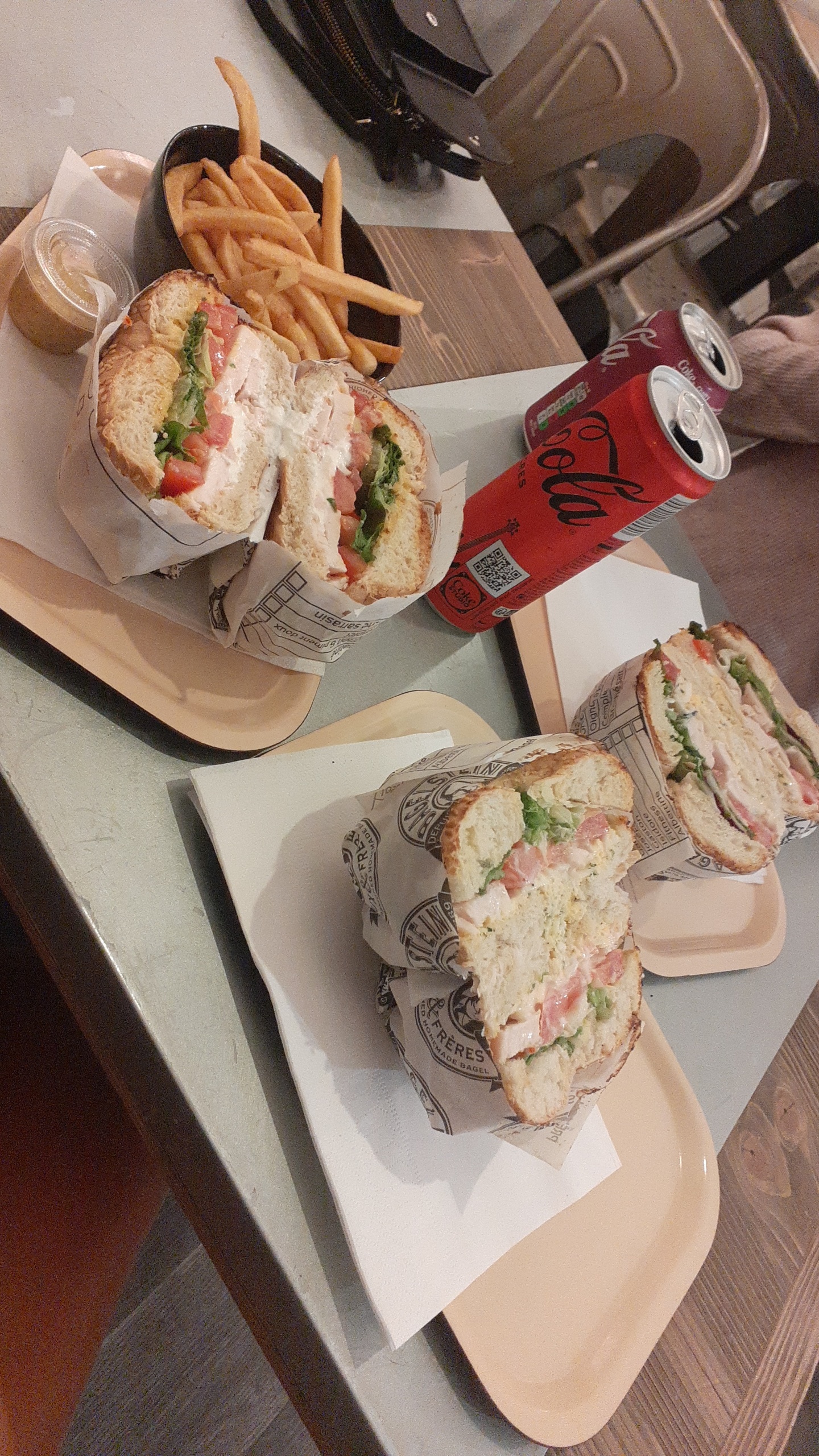 Bon dans l ensemble mais ça ne vaut pas le prix et l addition est plutôt salée... (3,50 pour une portion de frites, au vu de la quantité C est assez cher et C est des frites sans matière grasse, donc elles ne seront pas croustillantes, C est d ailleurs dommage de ne pas le préciser, j en aurais pas commandé si je l avais su) Il y a une vitrine où sont entreposé les bagels déjà préparé et ont vous invite a vous servir, ceux là sont donc froid. Si j avais voulu prendre un sandwich tout près je l aurais acheté à casino ou utile... Les soft sont aussi cher, les prix démarrent à 2e pour une petite bouteille d eau.... Résultat ça fait vite entre 13 et 15 e par personne pour manger un bagel, une frite qui n en est pas vraiment une et un soft.... L attrait de la nouveauté m a poussé a tenter mais ça sera la seule fois. Y a quantité de meilleures options pour un prix plus raisonnable... Dommage...