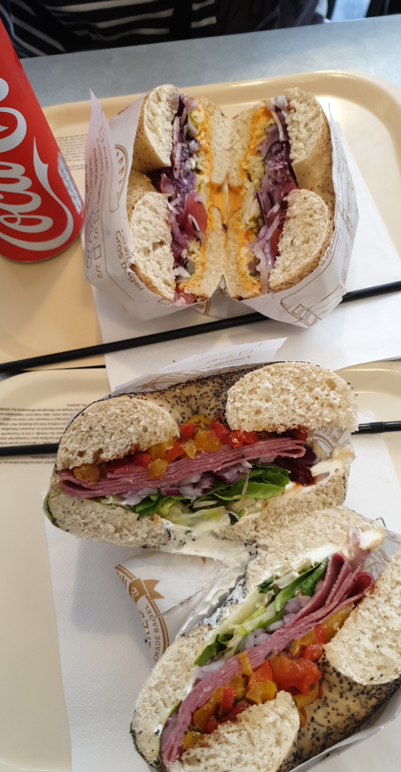 Quel bonheur de retrouver le parfum des bagles de chez moi ! Le cream cheese a aussi un goût très proche. Il y a pas mal de choix salé comme sucré a ec de nombreuses garnitures. Je regrette qu'il n'y ai pas une versionsans gluten...