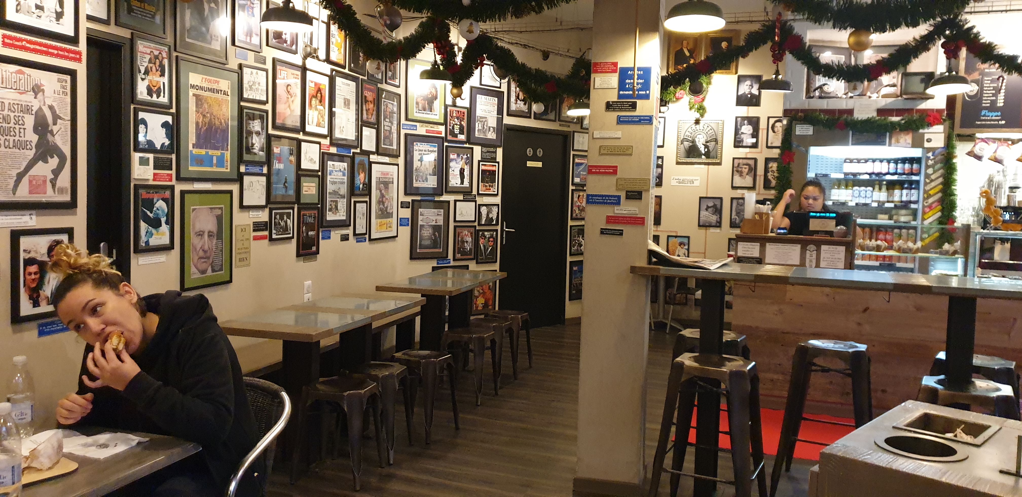 Un lieu très agréable avec des unes de journal en décoration ! Bagel au top !