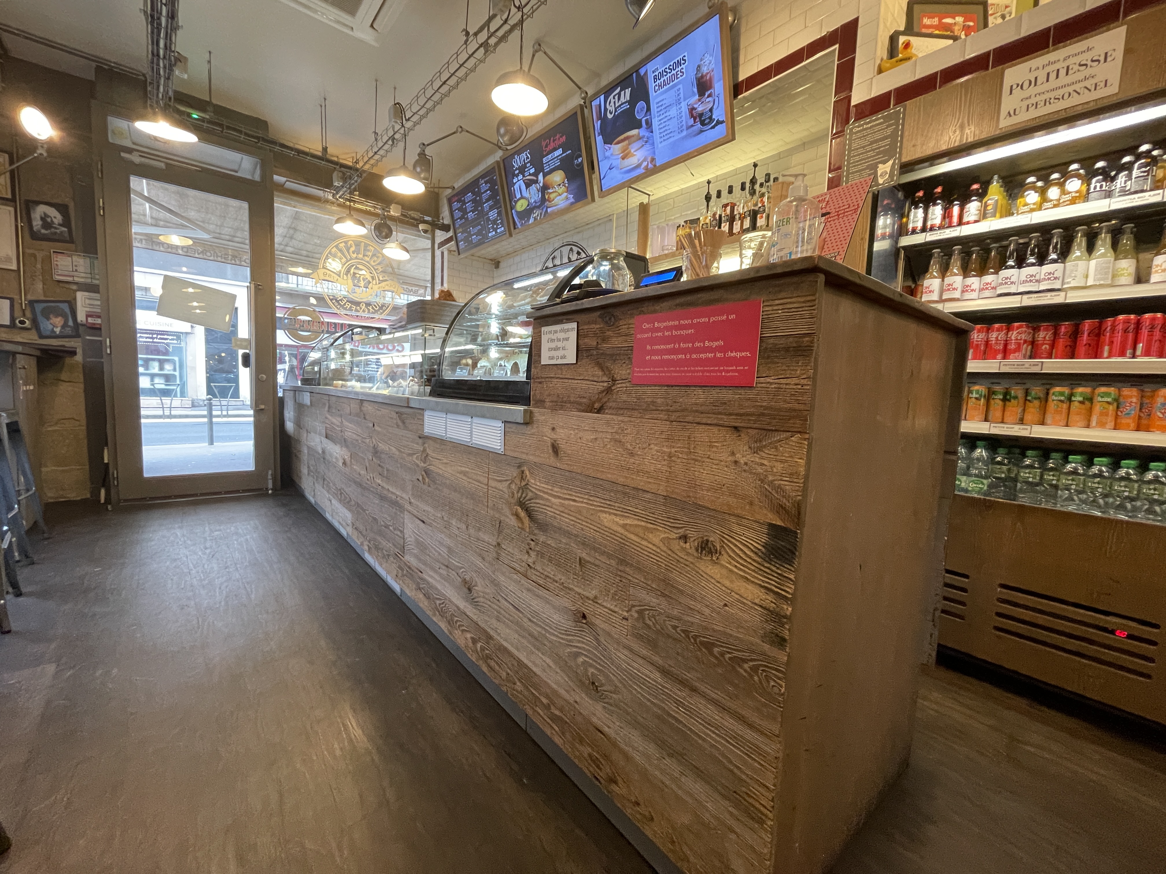 Lieu de restauration totalement incontournable, aussi bien avec leurs très bons bagels qu'avec leur décoration. À chaque endroit où se posera votre regard, une blague vous fera sourire. Un large choix de bagels, à prix très abordable, un service rapide, et un personnel très sympas ! Le petit point noir léger est un manque d'espace pour manger.
