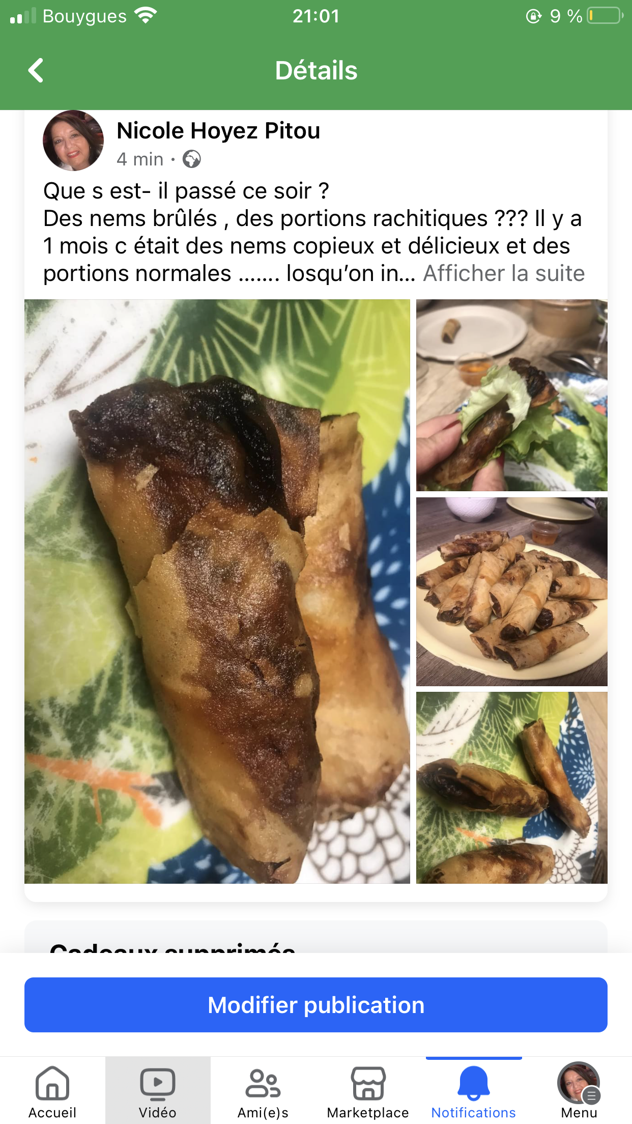 Que s’est-il passé ce soir du 20 janvier …. Nems façon « métro » à moitié brûlés portion rachitique de riz et de soupe sans le sachet habituel de chips de crevettes ? Le?? Sans sauce de soja , 1 brin de menthe pour 7 personnes ??? Ou sont passés les portions généreuses et les nems faites maison que l on a dégusté inlassablement tout le mois de décembre avec notre équipe en tournée …. Déçue quand on en fait l’éloge avec ses invités venus ce soir pour un moment de partage juste l impression d’une arnaque Les photos parlent d’elle-même