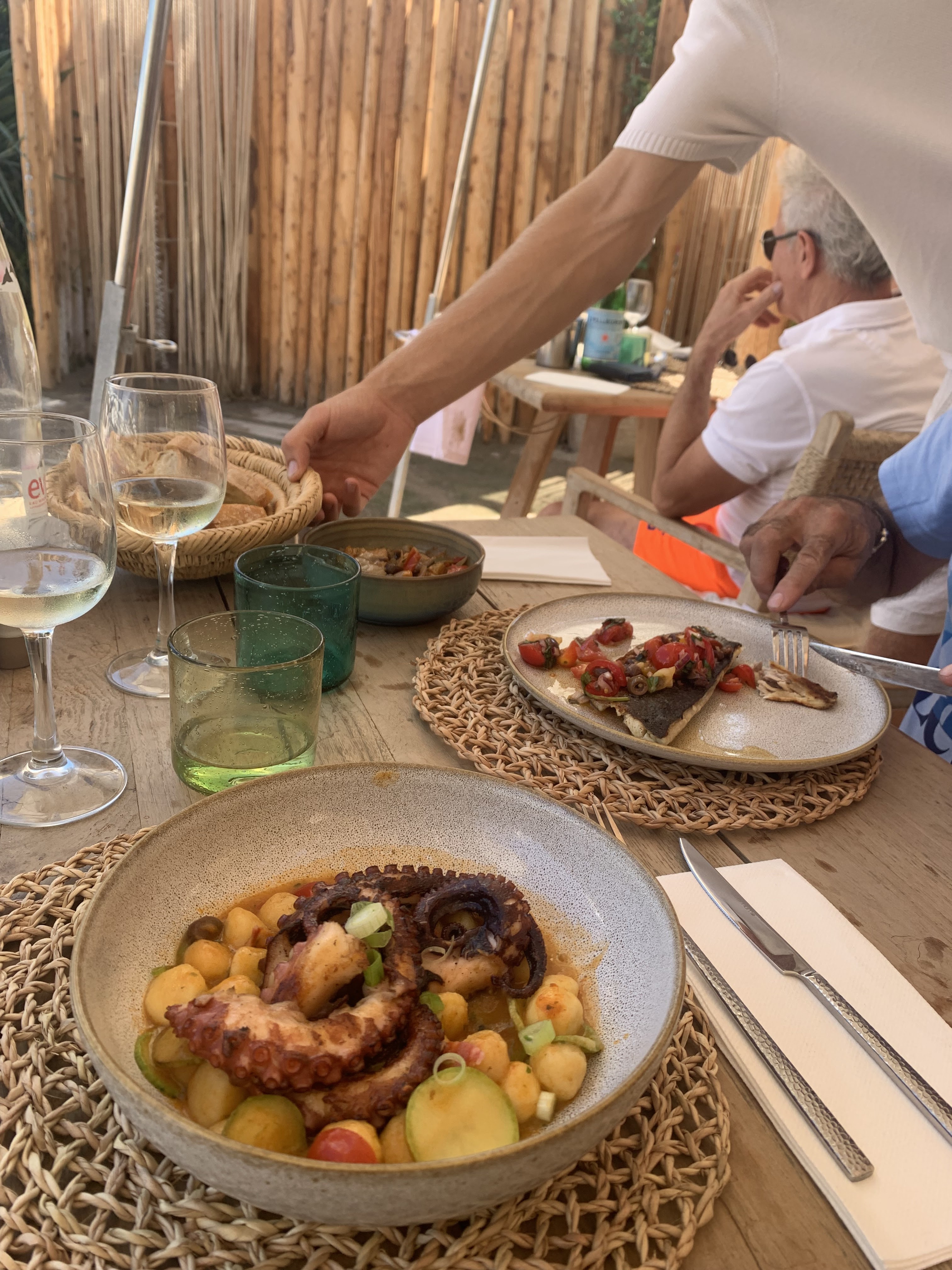 Un repas délicieux,un cadre magnifique mais musique trop forte en permanence sur la plage l'après midi et ... besoin de roder les équipes.En arrivant le matin ,la table était bien réservée ( site internet) mais aucune trace de réservation des transats ( par téléphone comme demandé sur le site). Au restaurant,une équipe très sympa mais qui a du mal encore à se coordonner et qui oublie...4 demandes de café qui n'arrivera jamais même au bout de 20 minutes, facturé mais non servi, avec néanmoins une remise gracieuse de ce café lorsque nous le signalons au moment de partir. Cela reste un très bel endroit et une bonne cuisine, mafaldines au poulpe parfaites.